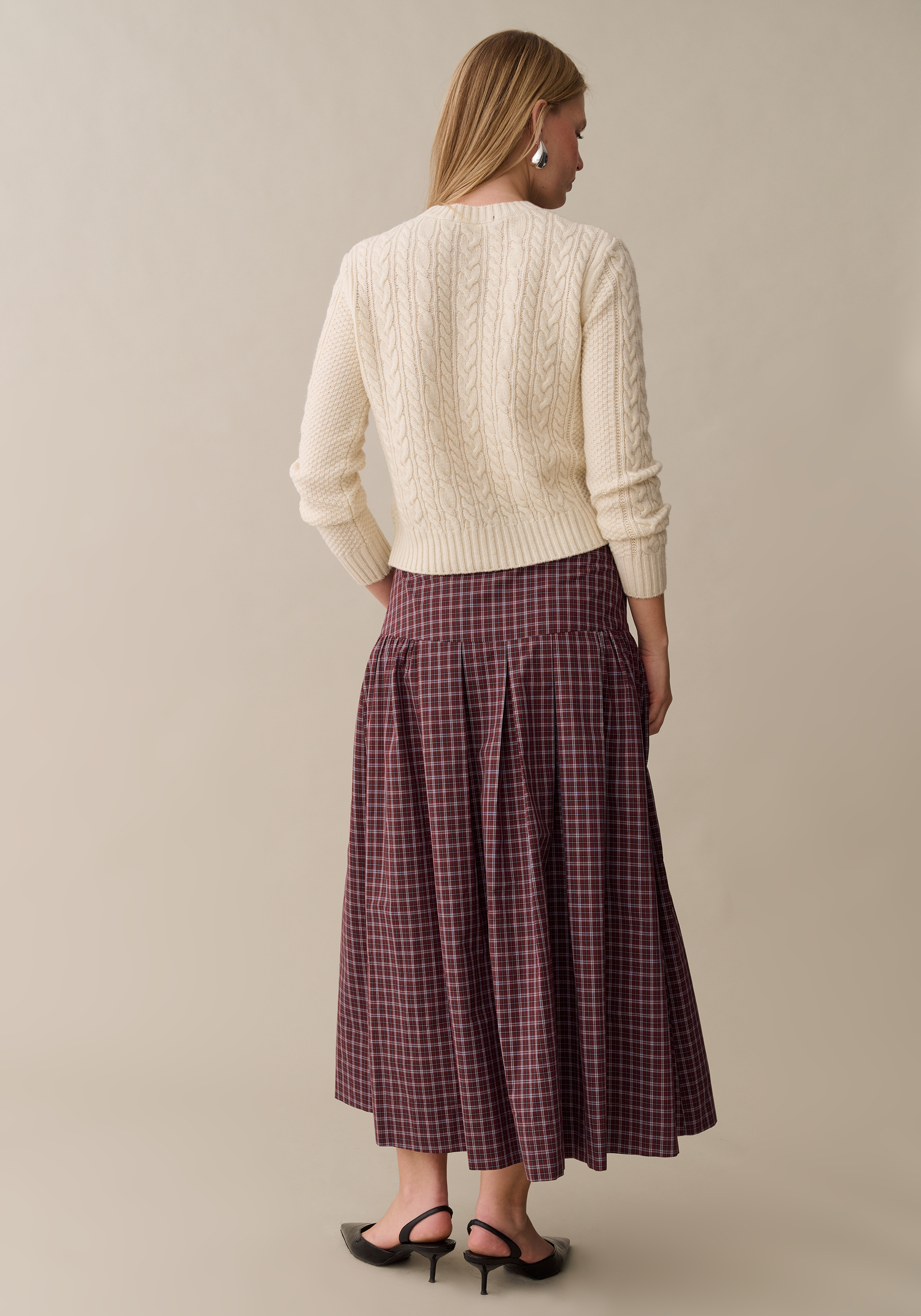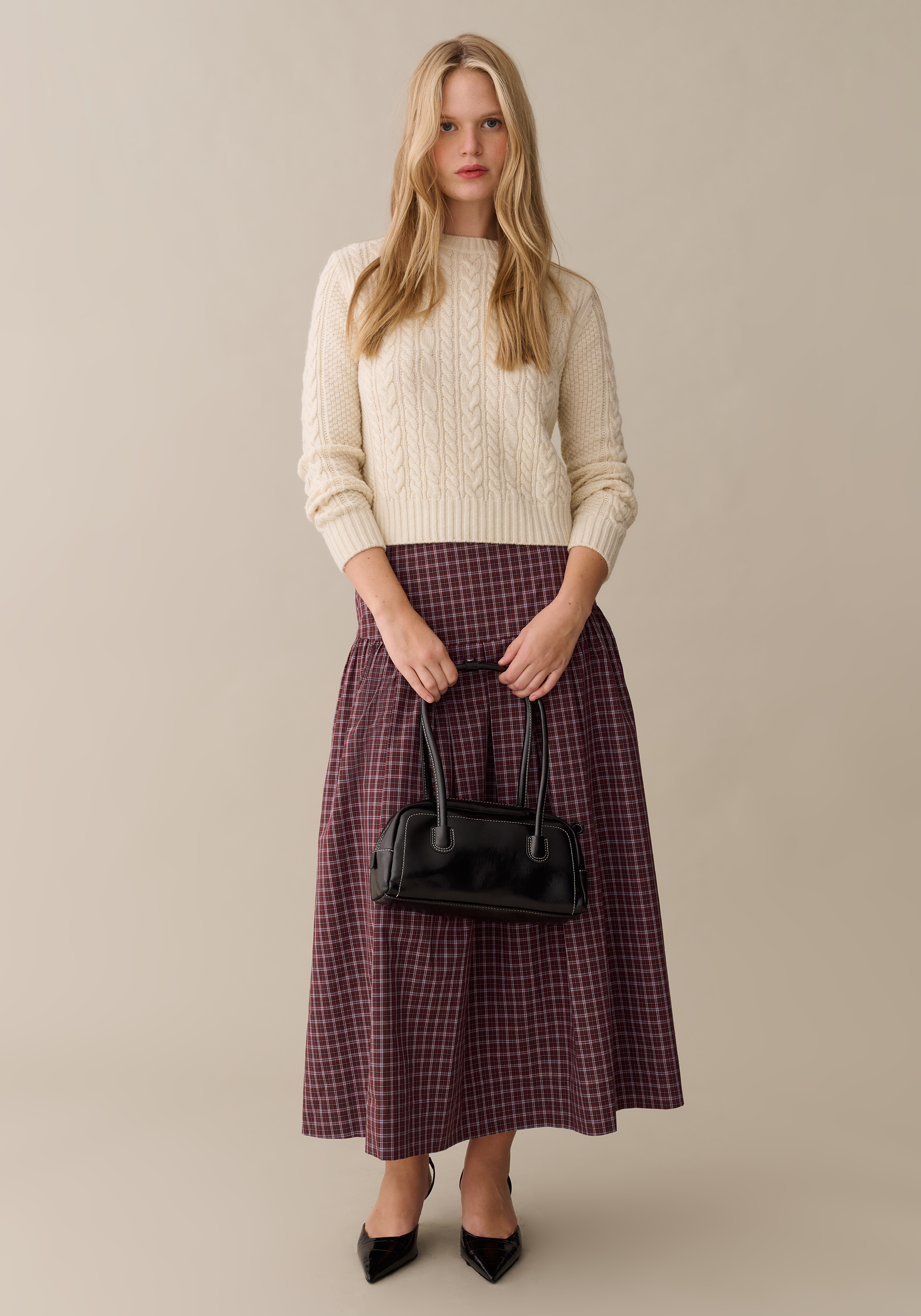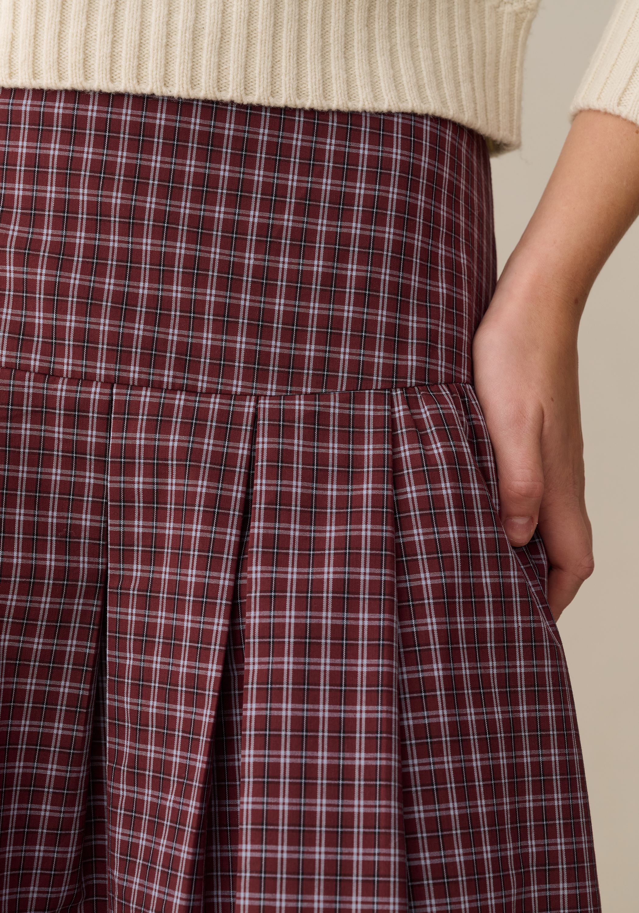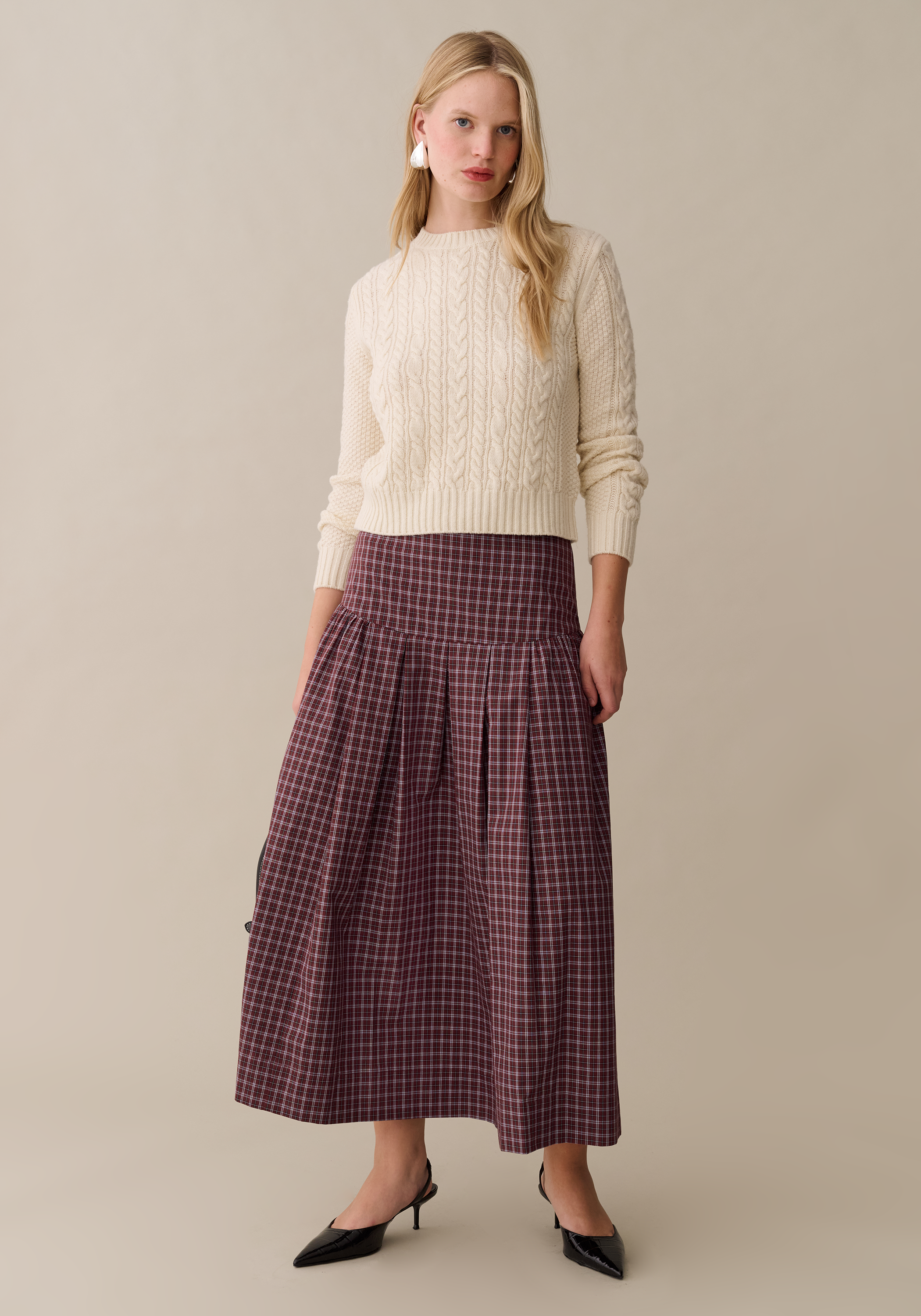 This checkered midi skirt features a softly structured silhouette with wide pleats that create volume and movement. The fitted waistband offers a clean, flattering line before opening into a full shape. Effortlessly versatile, it pairs just as well with cozy knits as it does with refined blouses.
