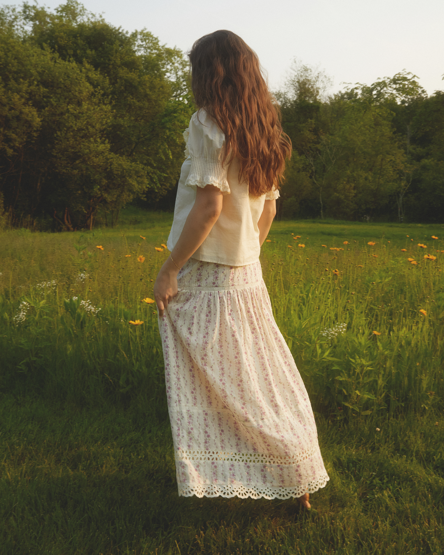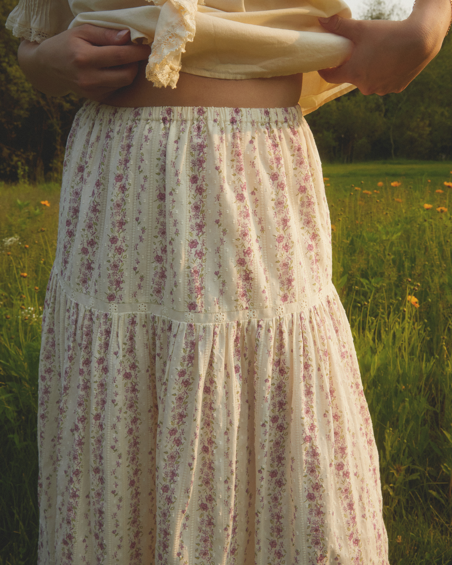 The Eliette Skirt combines a sweet ditsy floral print with intricate eyelet lace trim for a delicate, feminine finish. Its tiered, floaty fabric layers offer graceful movement, while the elastic waistband provides an easy, comfortable fit.