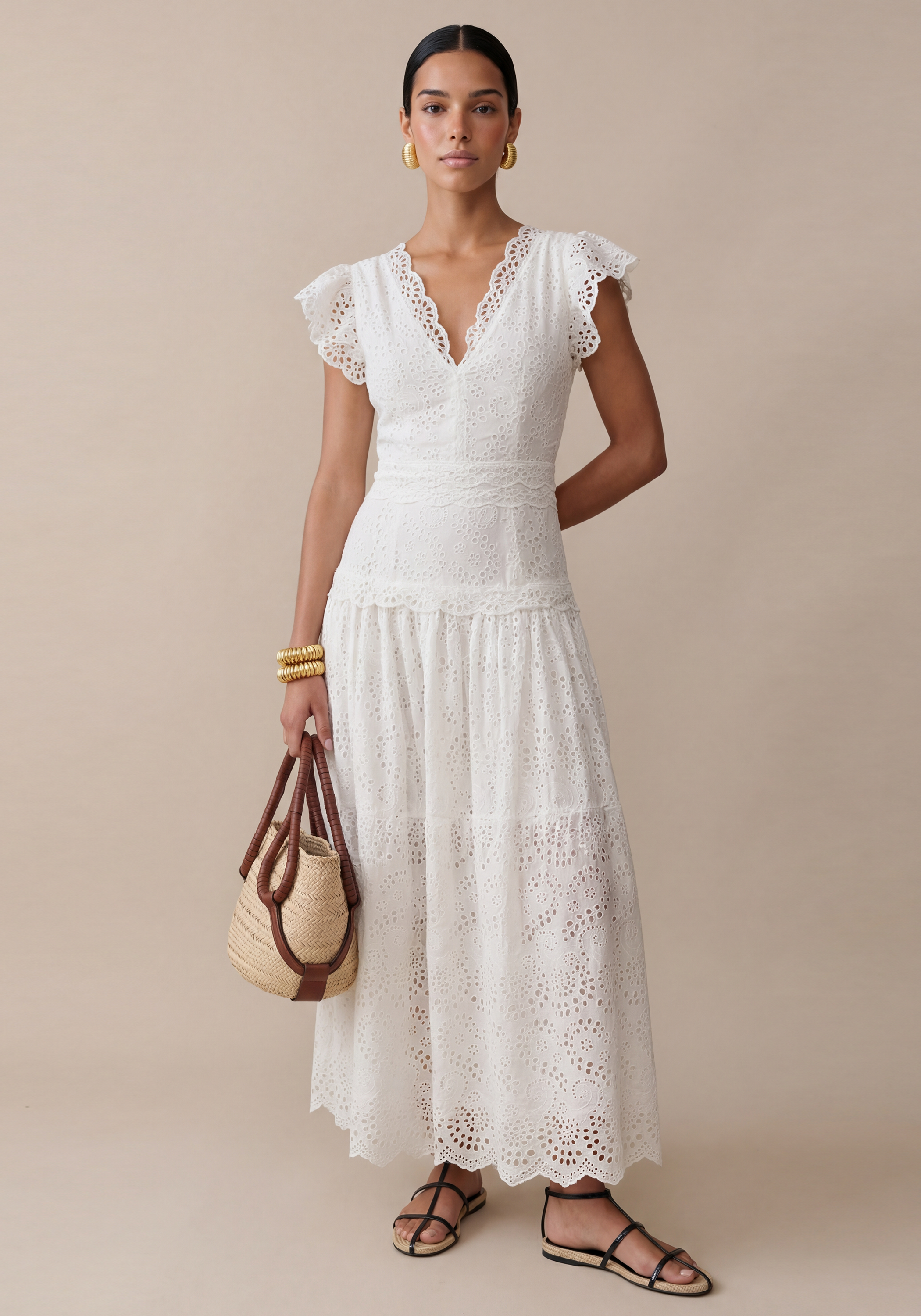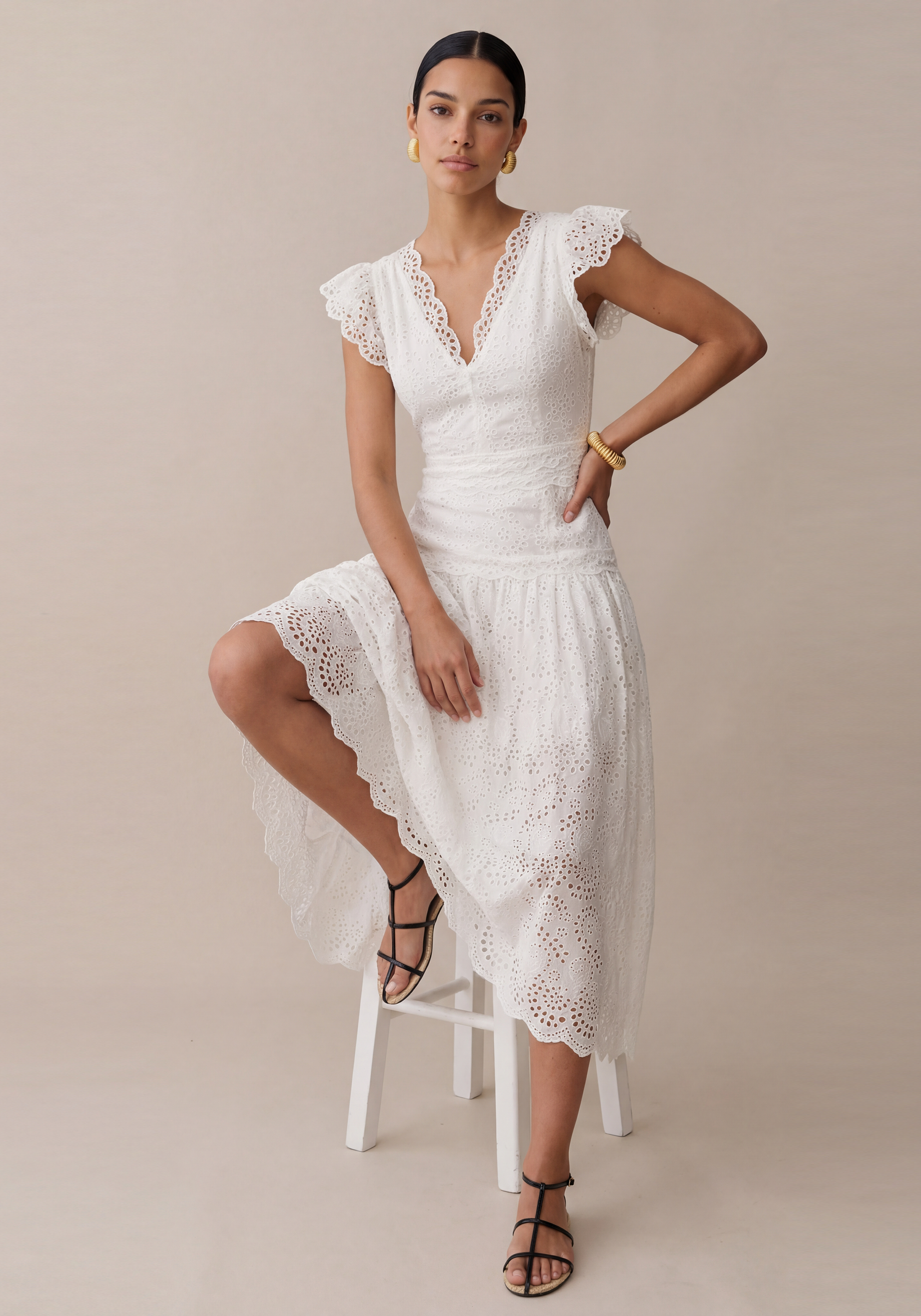 The Nella Dress expertly blends refined details with feminine charm. It showcases a sleek V-neckline and functional front buttons that add subtle sophistication. The fluttery ruffle sleeves bring a light, airy feel, perfectly complementing the flowy skirt that moves gracefully with every step.