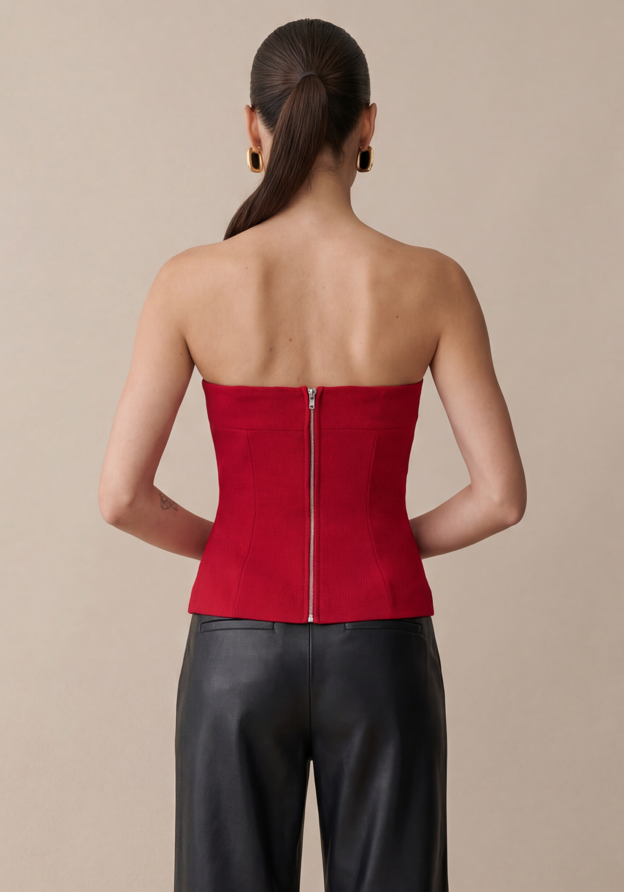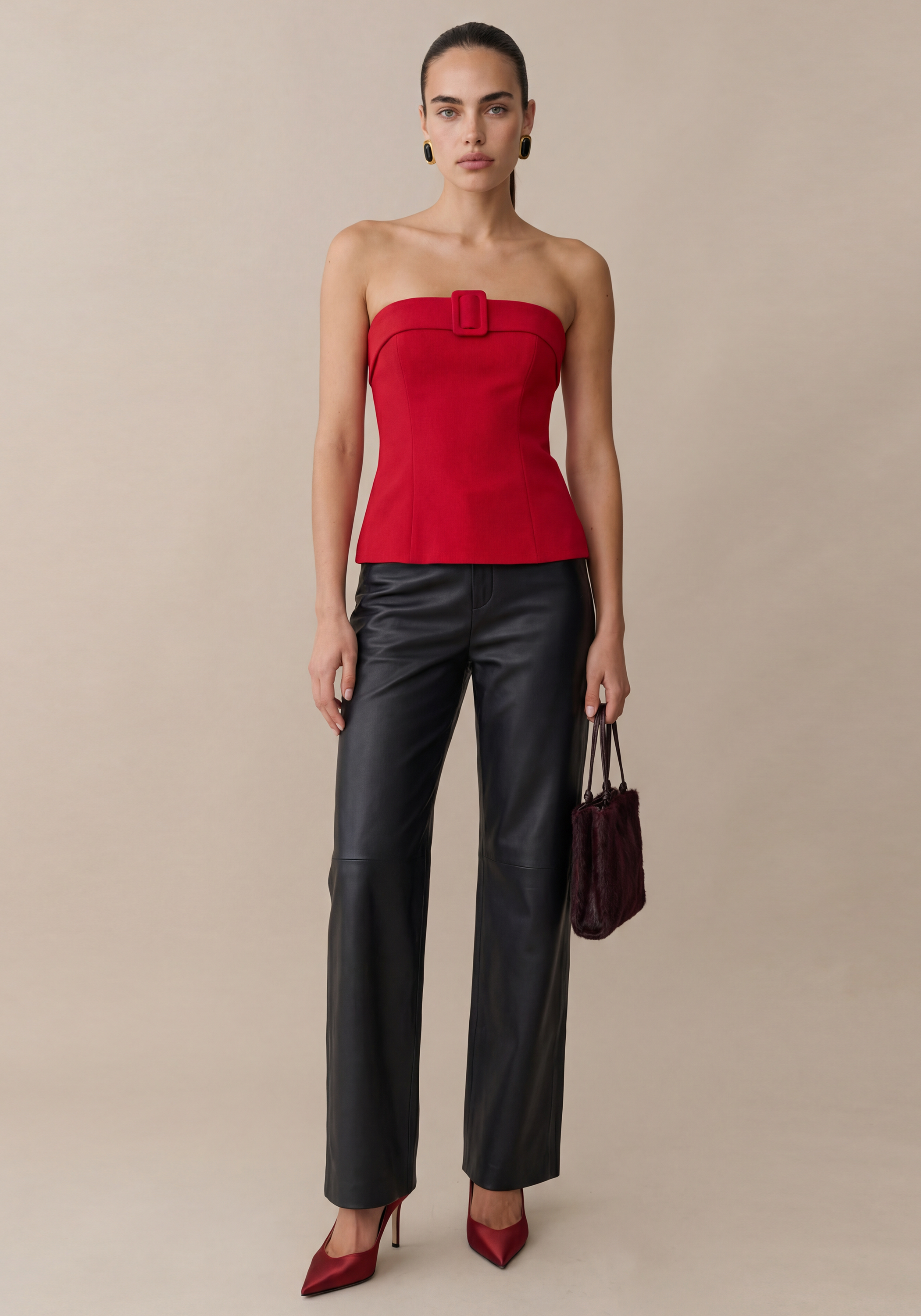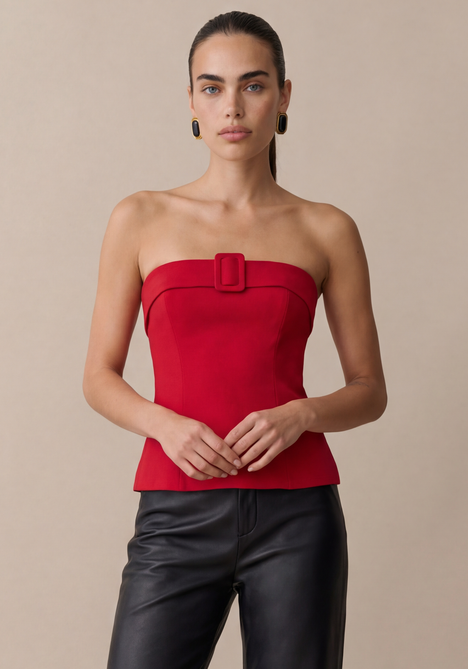 The Daye Top features a strapless design with elastic neckline for security and comfort. Its front buckle detail adds visual interest while the structured silhouette creates a refined look. Sophisticated yet effortless, this piece embodies contemporary elegance.