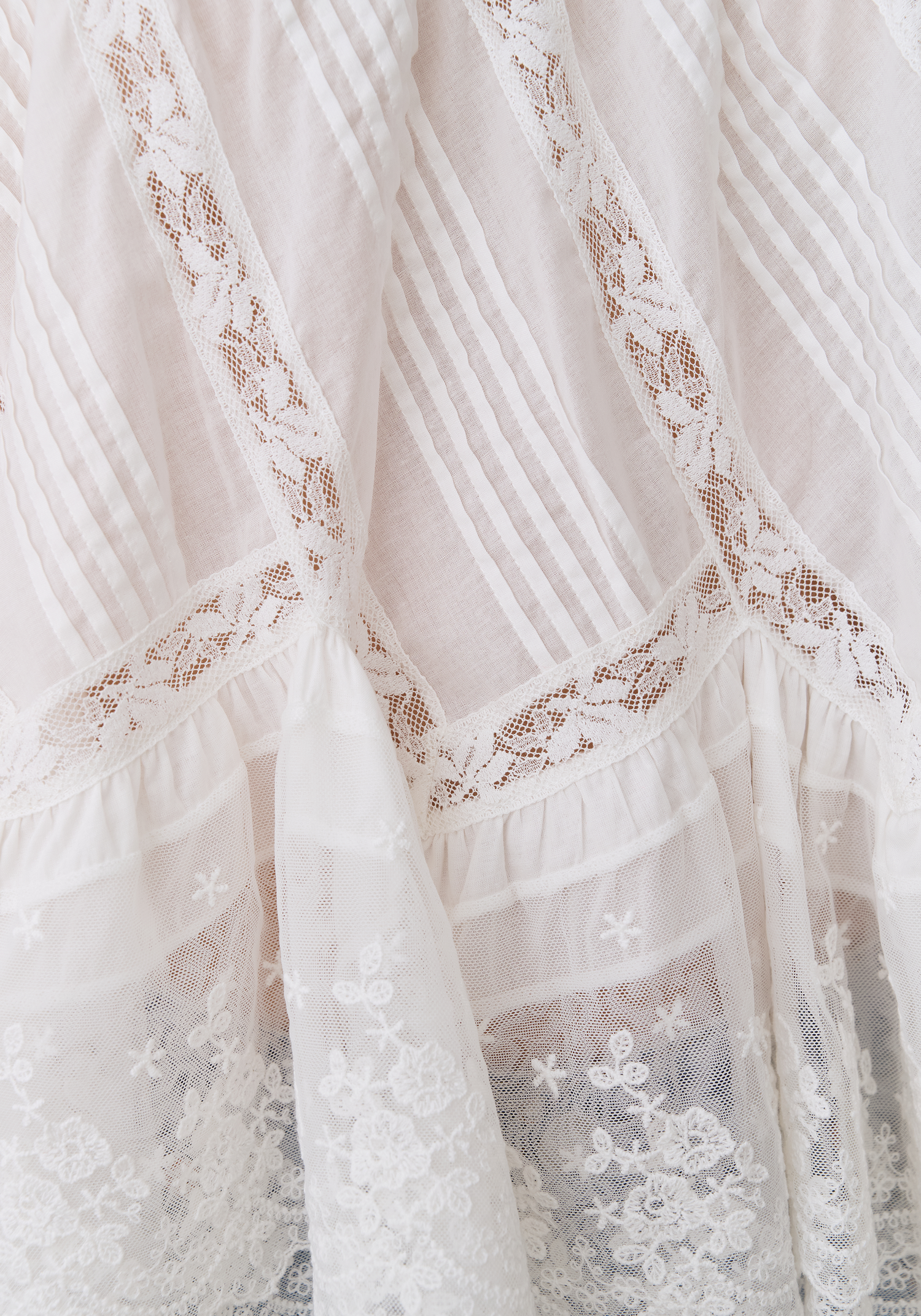 This camisole top features a beautiful play of texture with its diagonal pintucks and delicate floral lace inserts. Designed with lace-trimmed straps and a tiered, flared hem, it offers a sophisticated yet breezy silhouette that feels light and effortlessly feminine.