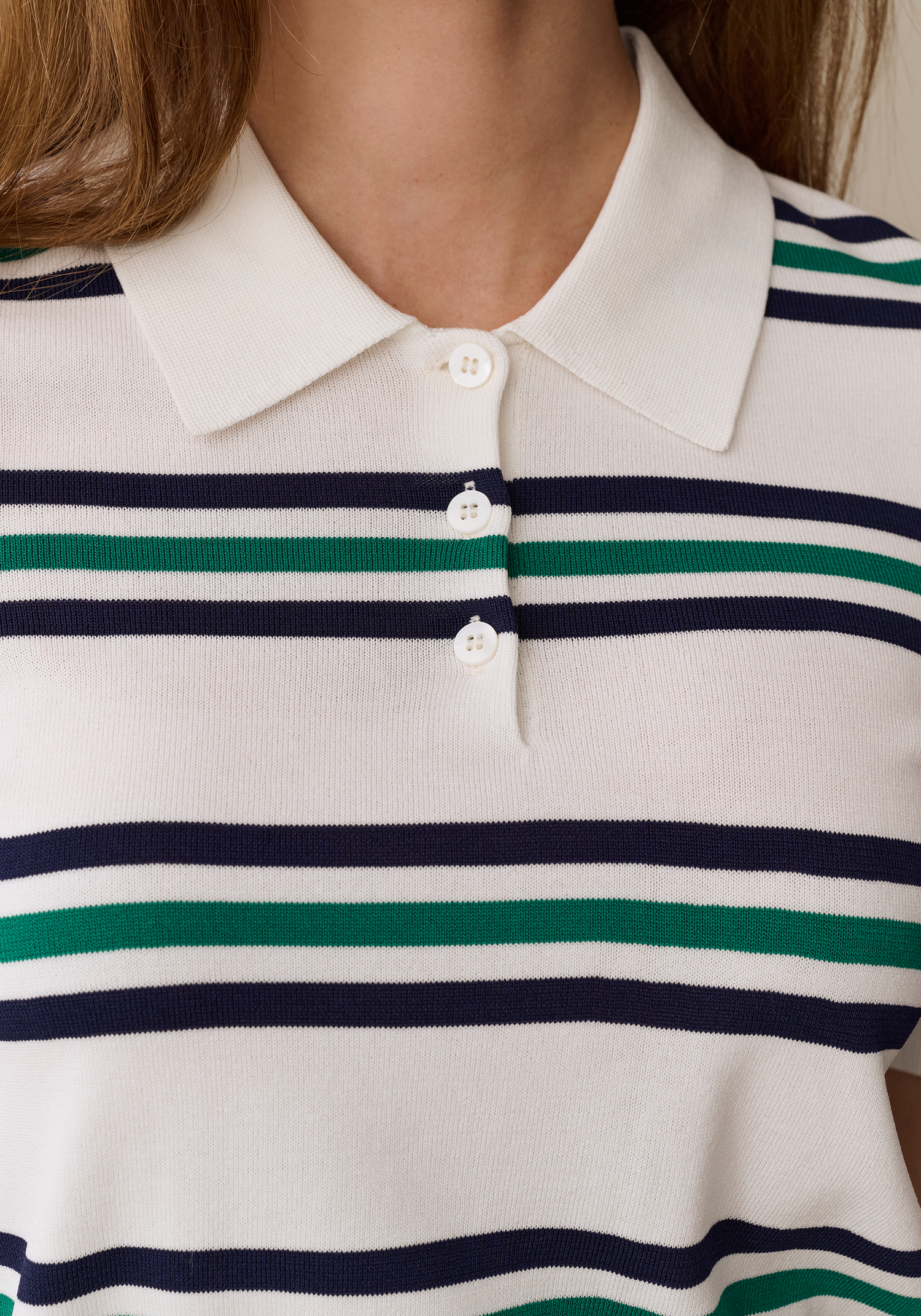 Meet the Paris Top, with a stretchy knit fabric to keep you comfortable while the striped pattern pops in crisp, vibrant colors. The cropped silhouette, collared neckline, and front buttons deliver that polished preppy look without feeling overdone.