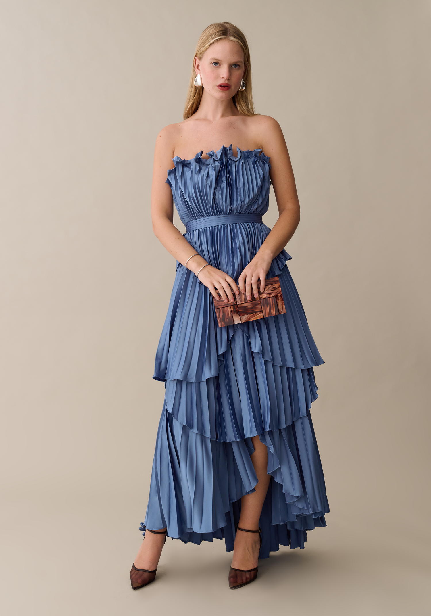 The Danae Dress features a strapless design highlighted by elegant ruffles, delicate pleats, and layered frills that create a textured, multidimensional silhouette. Its gorgeous blue hue is timeless and sophisticated, making it a perfect choice for formal occasions.