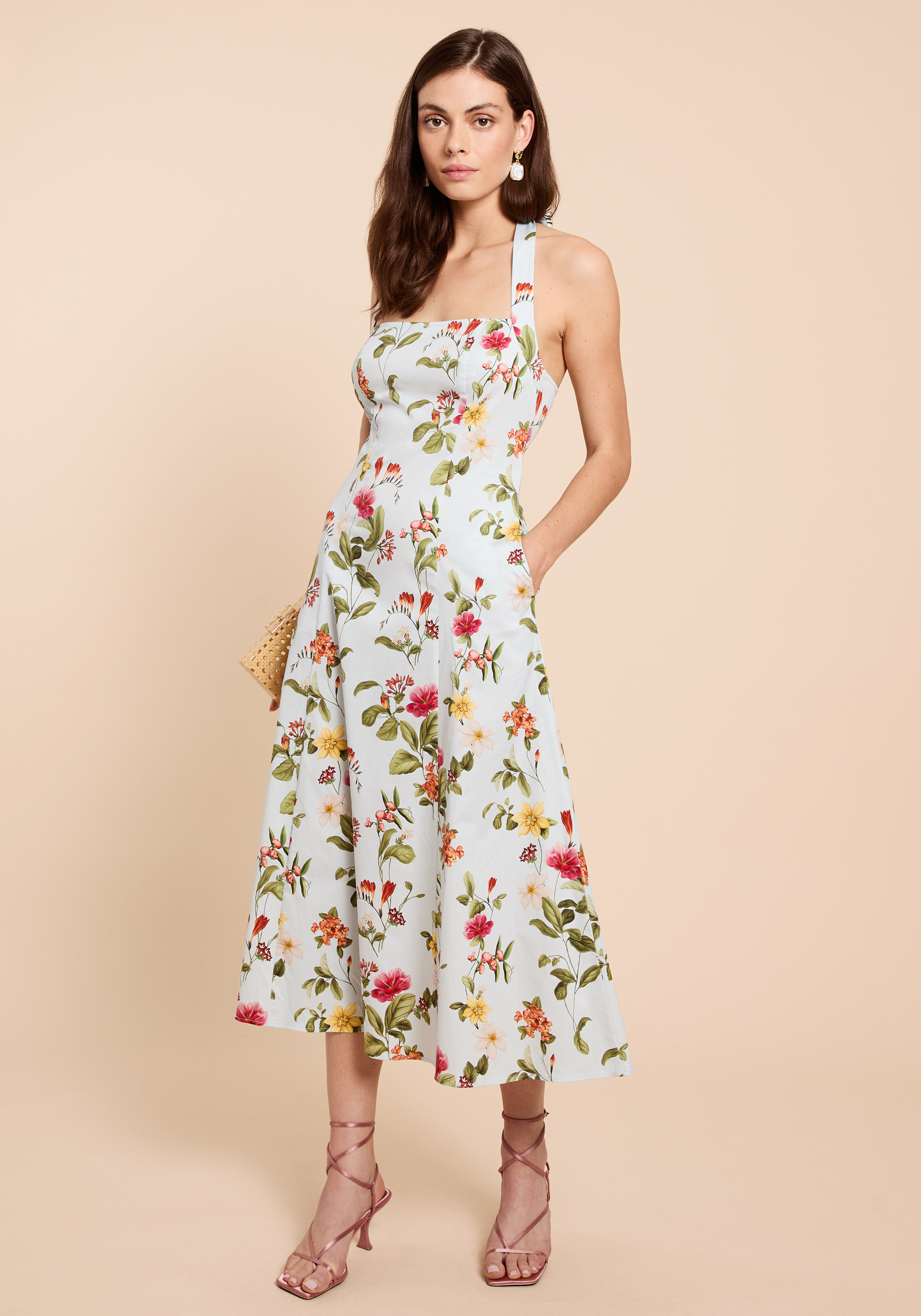 The Lior Dress features a fitted bodice paired with an A-line skirt, creating a sleek and flattering silhouette. Its easy adjustable halter necktie ensures a perfect fit, while discreet pockets add practical elegance.