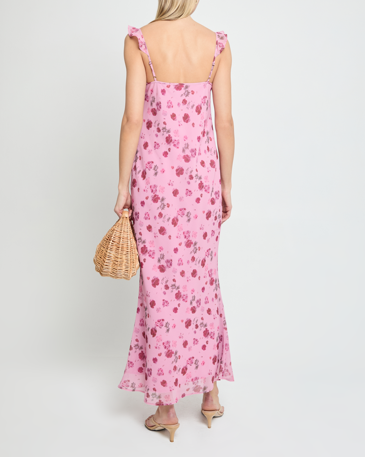 The Mabel Dress is a must-have for any sunny occasion. Made from gorgeous pink floral chiffon and adorned with playful ruffle details, this fun and flirty dress is sure to turn heads.