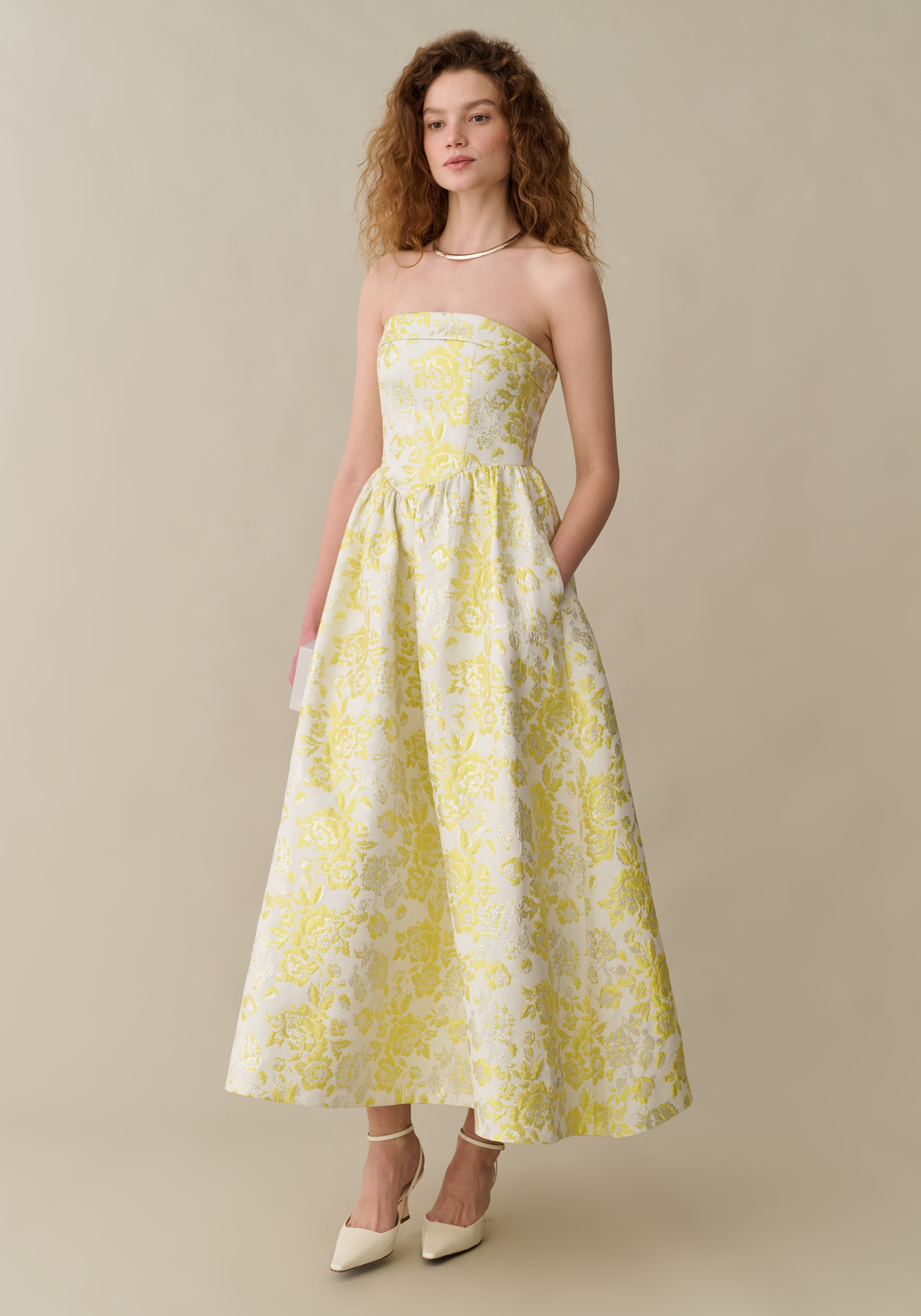 This strapless gown is crafted from a textured jacquard that catches the light with subtle dimension. The structured bodice and full, softly flared skirt create a timeless silhouette that feels both sculptural and effortless. Modern yet romantic, it’s a refined choice for weddings, galas, or evening occasions.