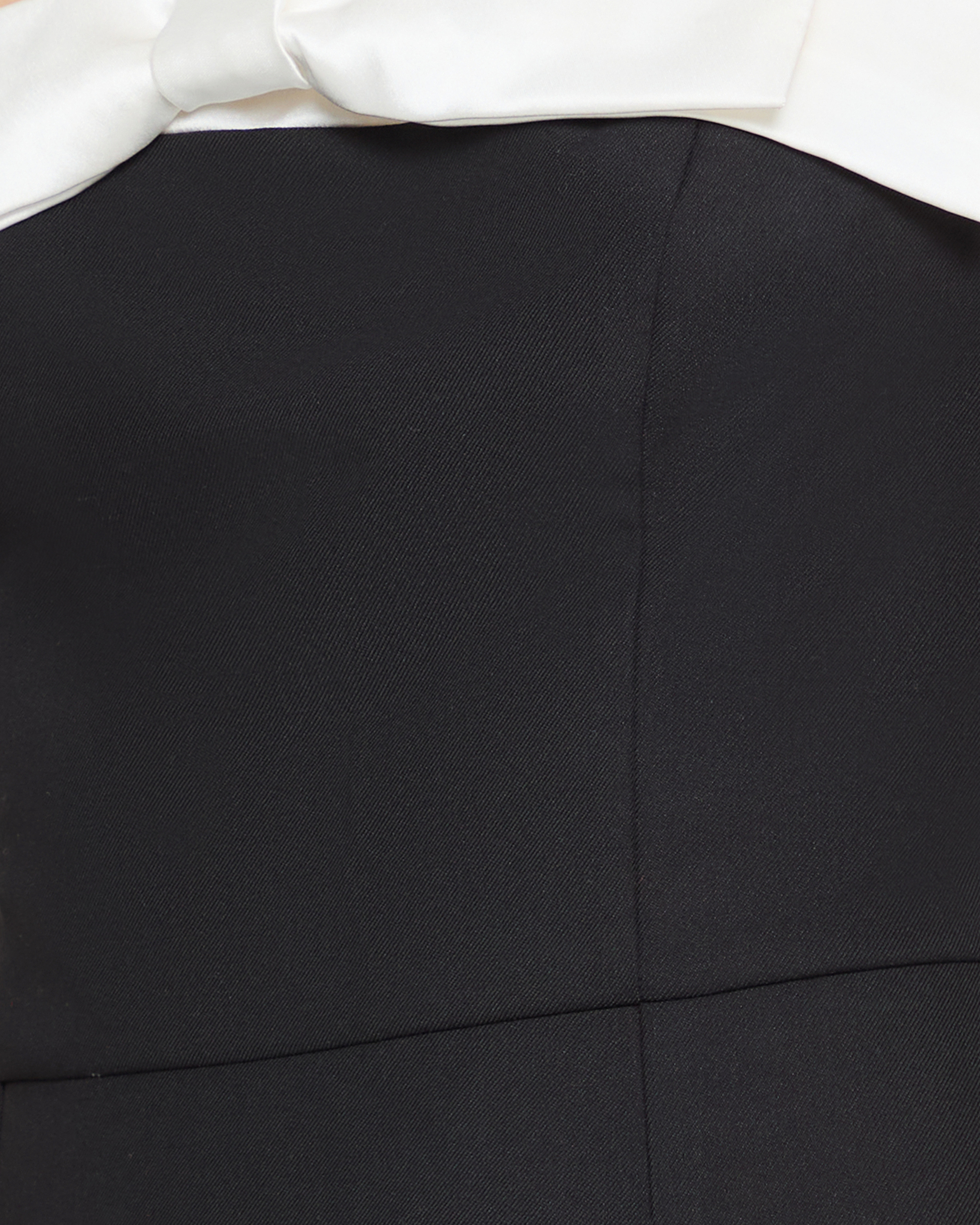 The Solana Dress boasts a sleek, fitted sheath silhouette and elegant strapless design, for a timelessly elegant look. The contrasting white bow detail at the neckline exudes classic charm.