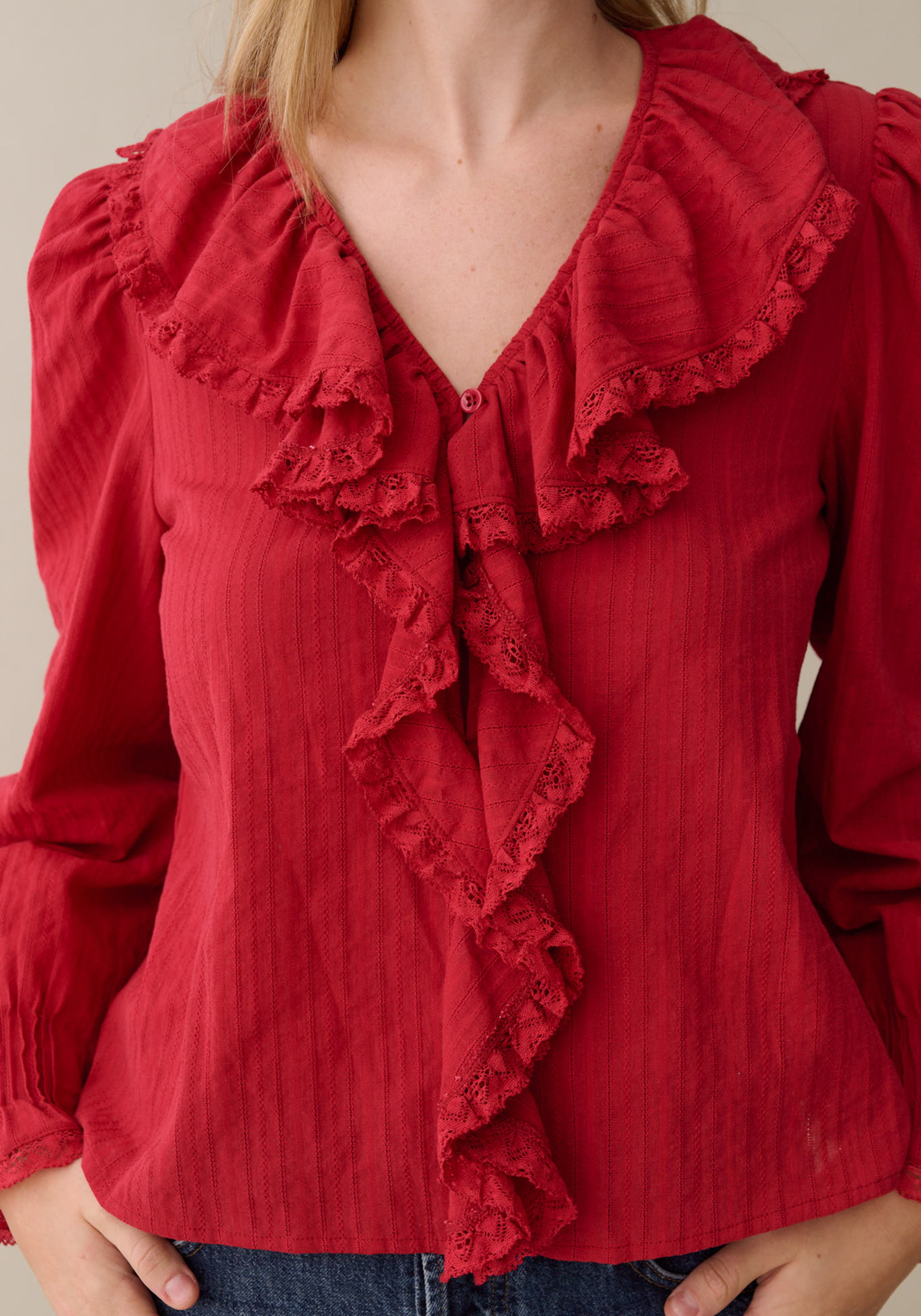 The Leda Top features a button-up front and delicate ruffles, made from luxurious textured cotton. Pleated details on the cuffs add a touch of elegance to this elevated piece.