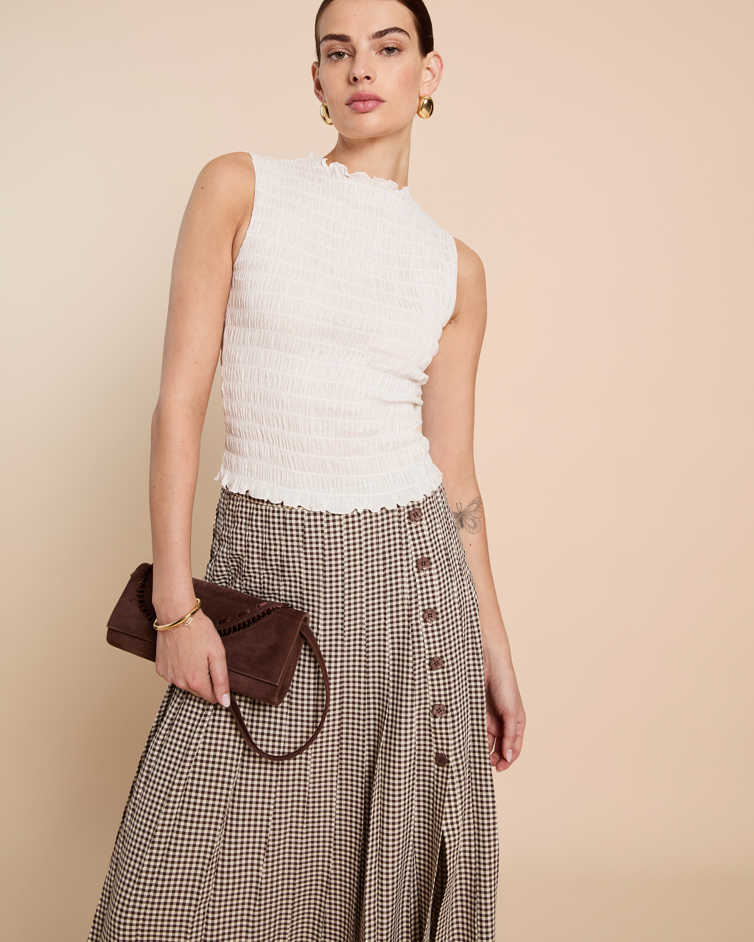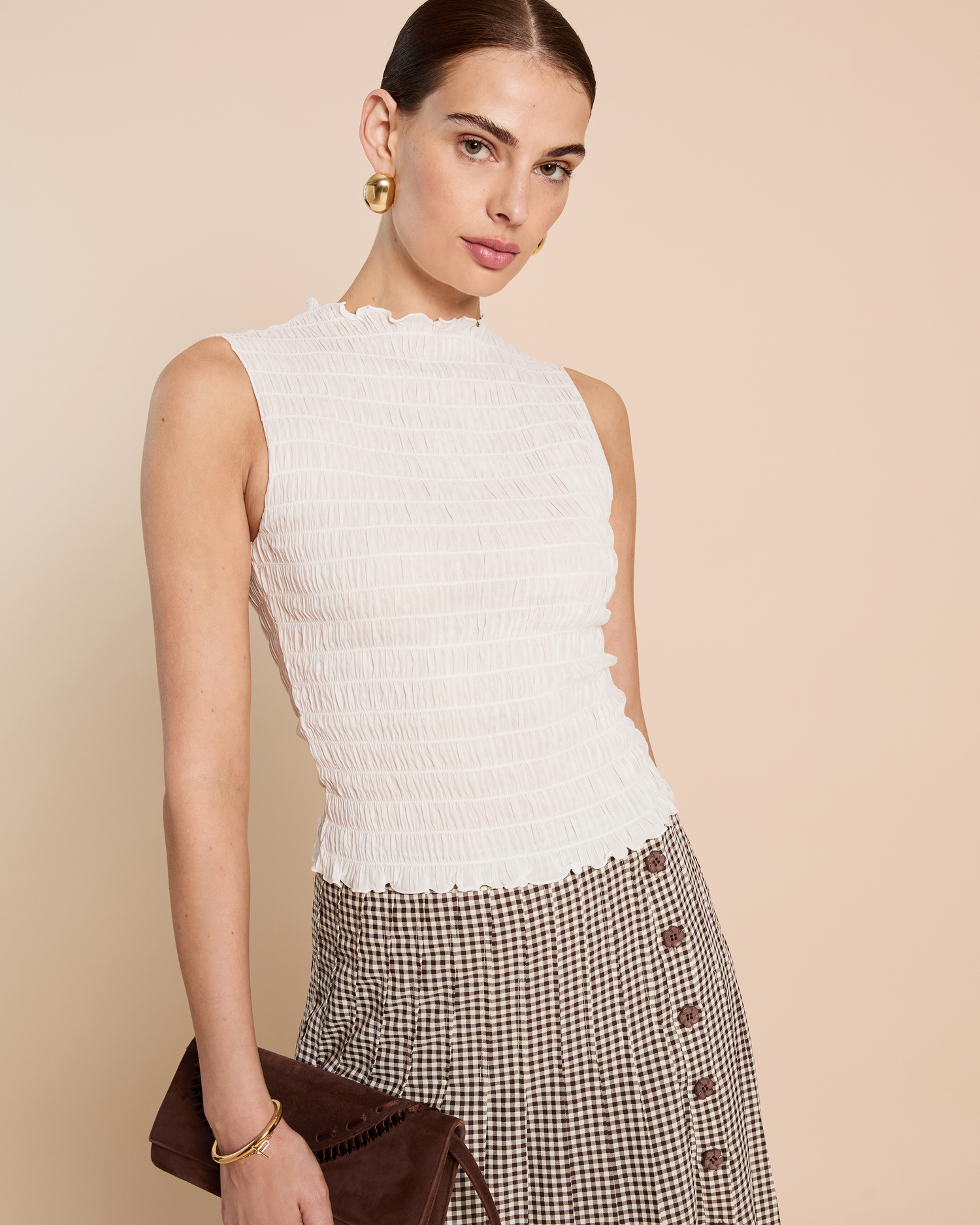 The Willa Top features a comfortable stretchy smocked bodice that creates an effortlessly form-fitting silhouette. Its chic high neckline adds sophistication to this versatile staple piece. Easily transition from casual to elegant by styling it up or down for any occasion.