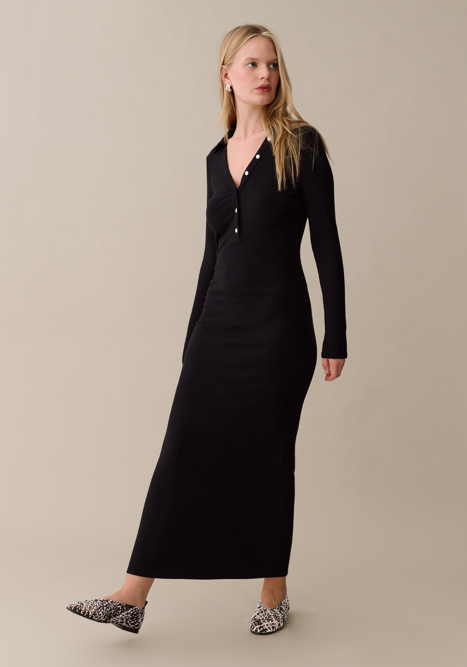 The Hazel Dress combines elegance and comfort with its form-fitting maxi silhouette made from soft, stretchy knit fabric. Designed with a classic collar and button-up front, this dress delivers a sophisticated, chic look while maintaining all-day comfort. Its flattering fit enhances your shape, making it perfect for both casual and dressed-up occasions.
