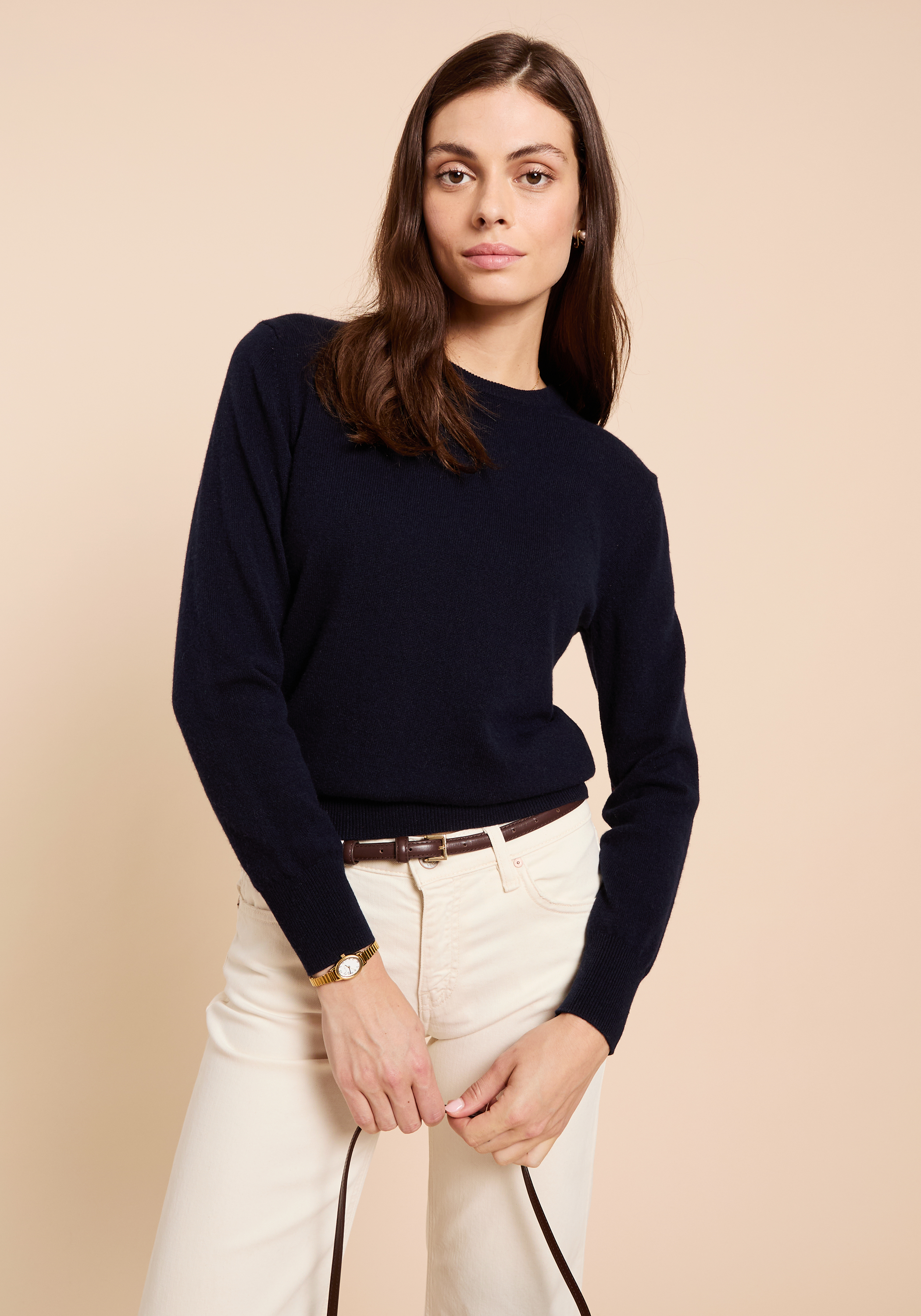 Feel cozy and look effortless in our classic, cashmere crewneck. Done with relaxed fit and ribbed knit hem, collar, and cuffs.