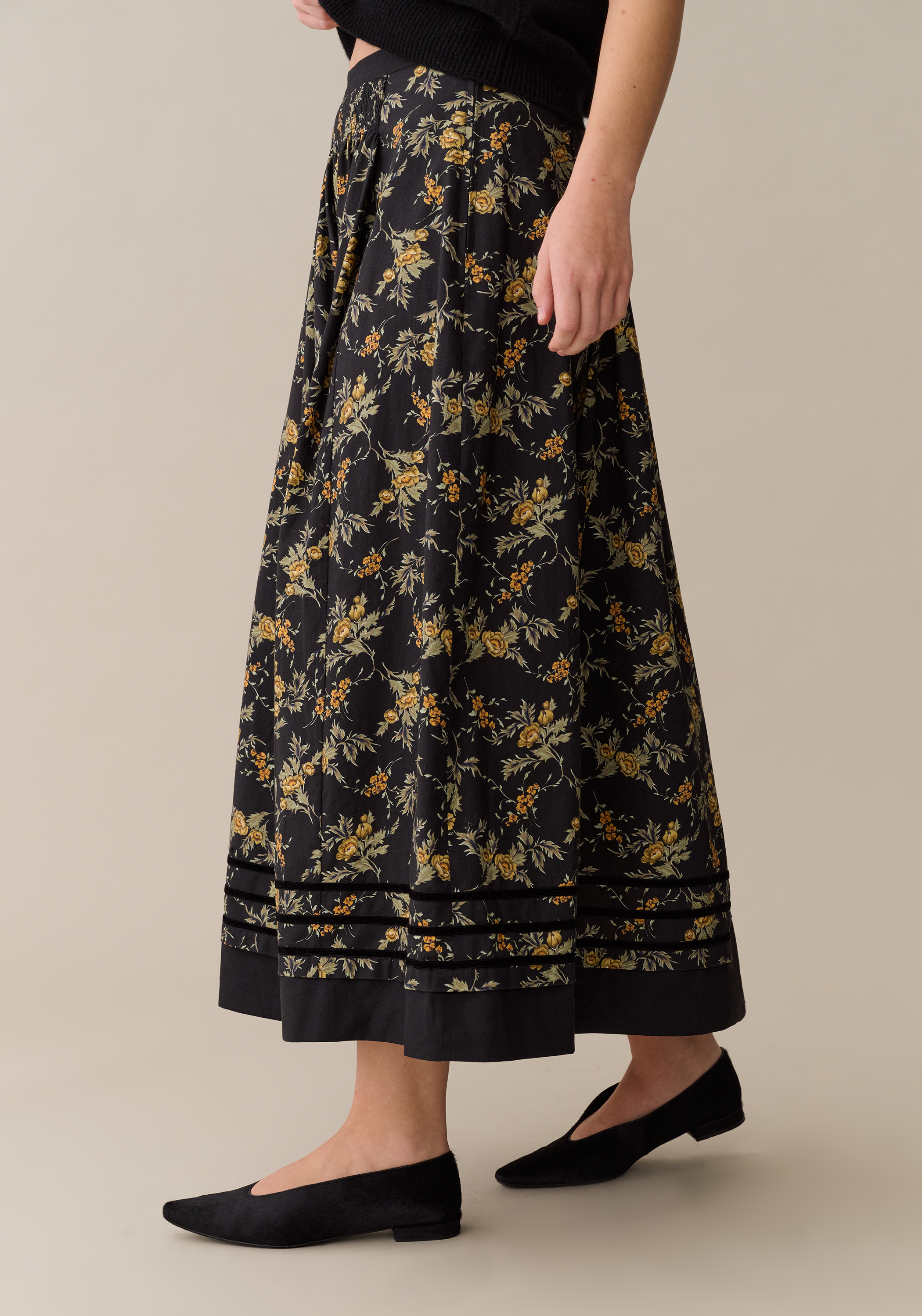 The Viola Skirt features exquisite smocked detailing at the waist, enhancing fit and comfort with a subtle texture. Accented by a luxurious velvet ribbon trim, this skirt is oh so romantic with true craftsmanship vibes.