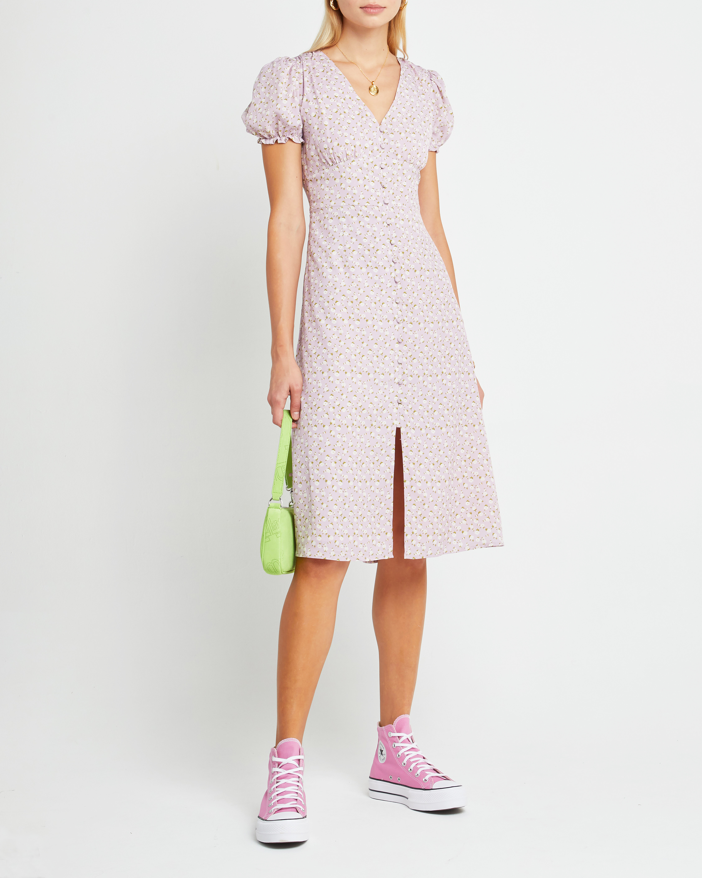 This charming style has a simple silhouette with sweet puff sleeves. Done in a rosy hue with button details.