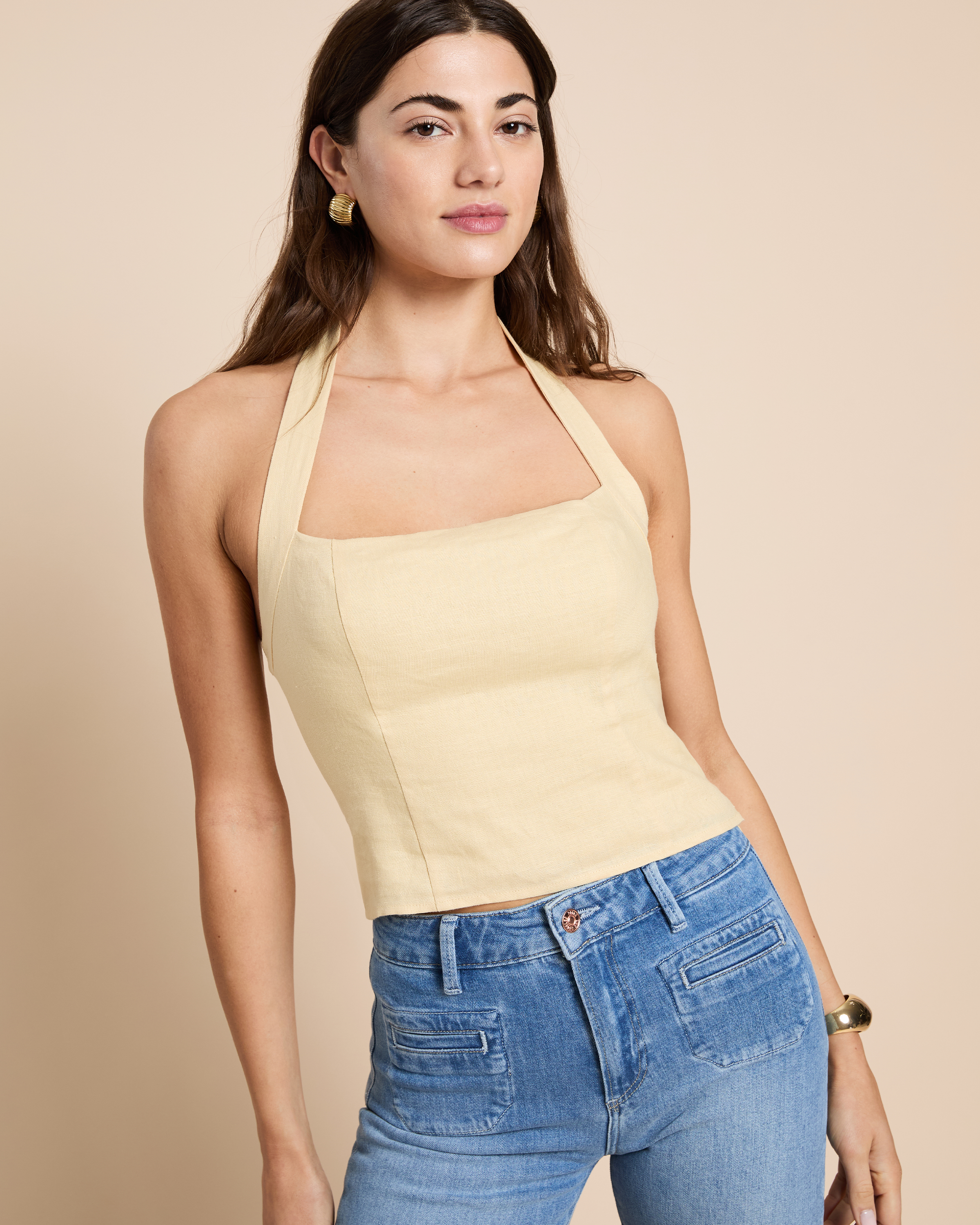 The Dixie Linen Top is a warm-weather staple with a flattering fit. Made from 100% linen, it features a tie halterneck and a clean, structured silhouette. Lightweight and breathable, it's an easy choice for sunny days and effortless styling.