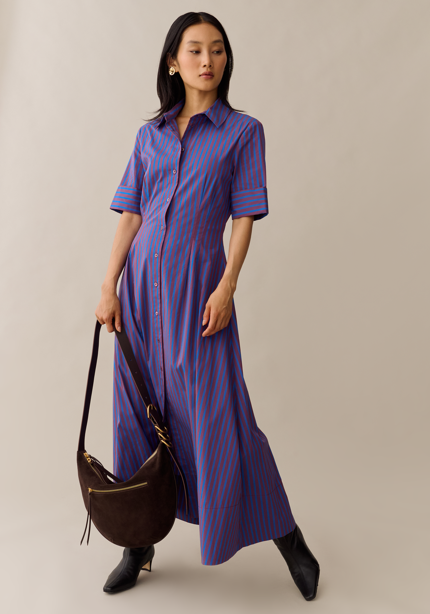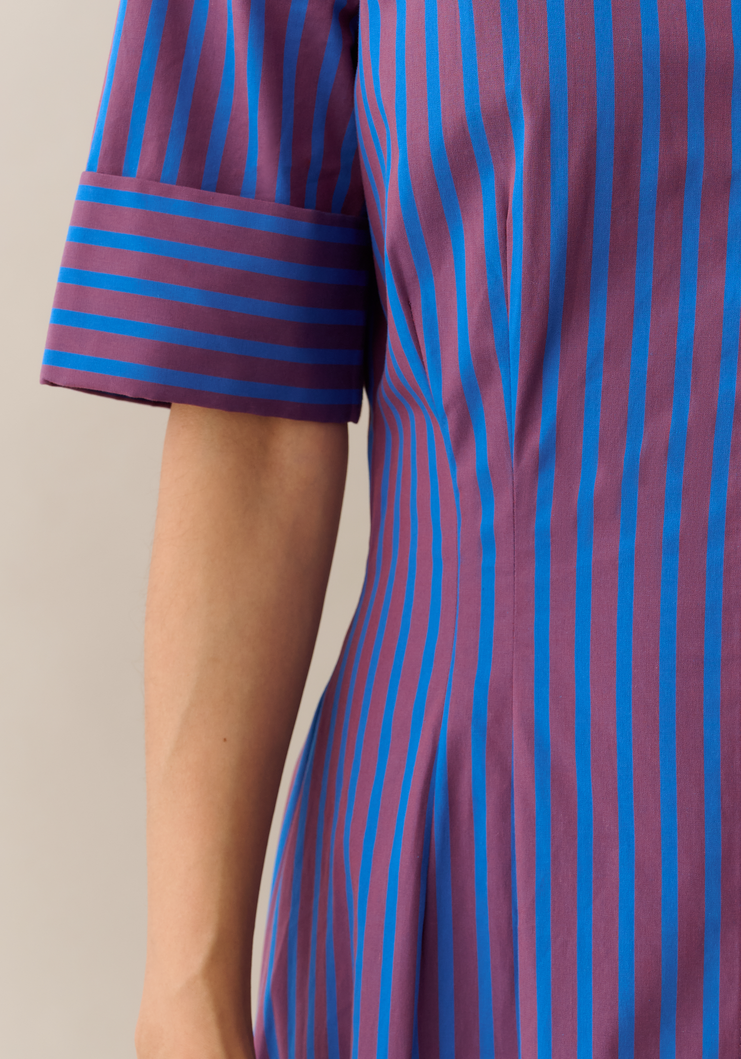 The Tallis Cotton Dress combines a striking cobalt and purple striped pattern with a classic button-up silhouette for a look that’s both fresh and enduring. Expertly tailored with darts at the waist, it offers a flattering fit that enhances your natural shape, making it perfect for both professional and casual settings. Crafted from breathable cotton, this dress ensures comfort without sacrificing style.