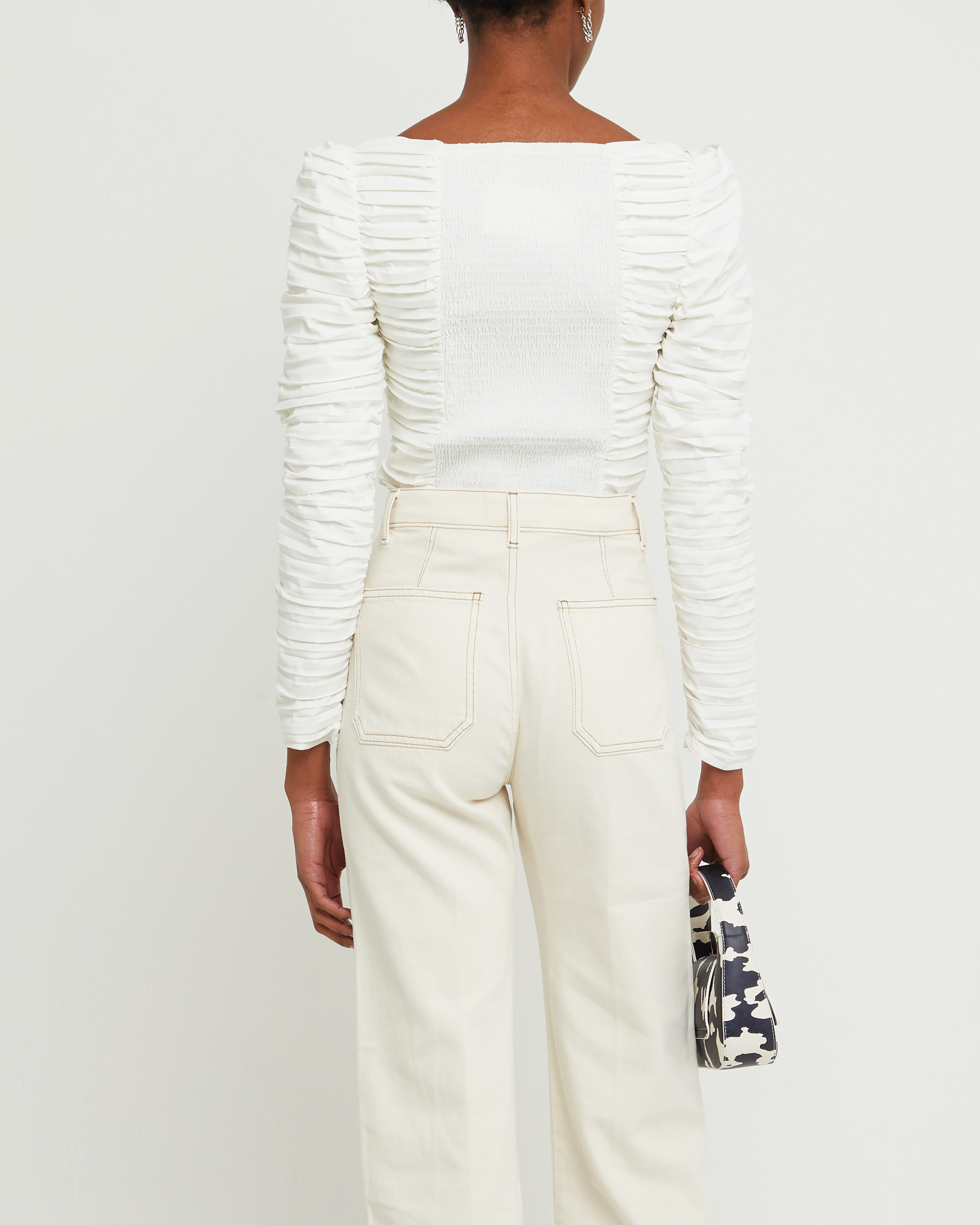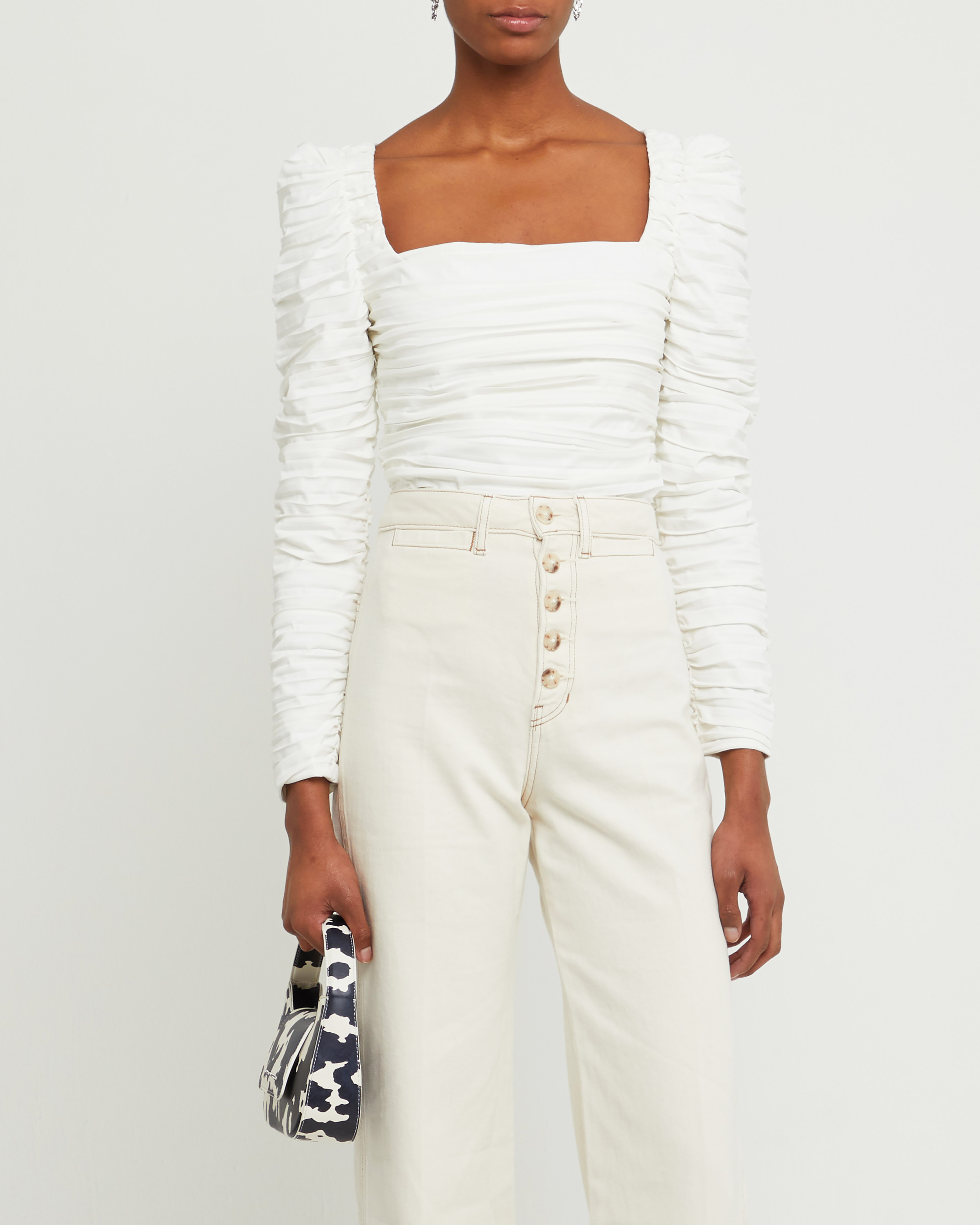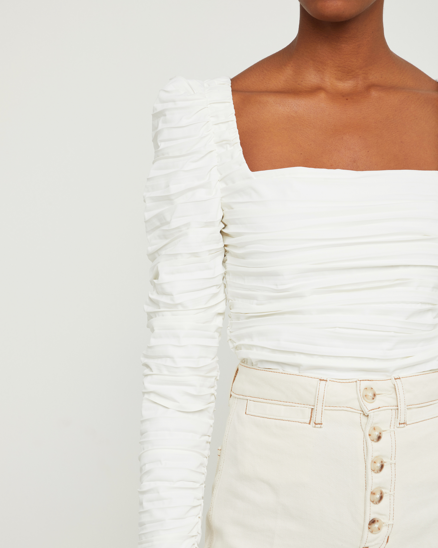 Elevated and chic, this ruched blouse is done in effortless, white cotton. Finished with a square neckline and subtle puffed sleeves.