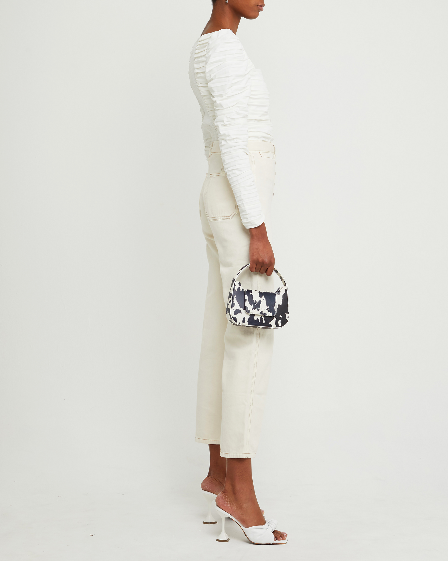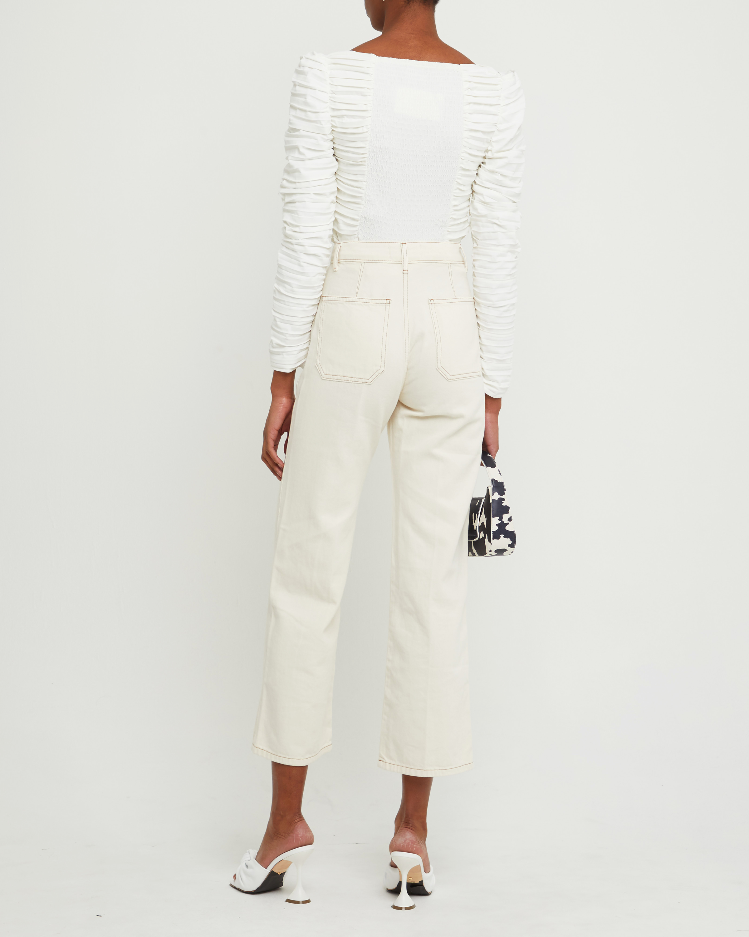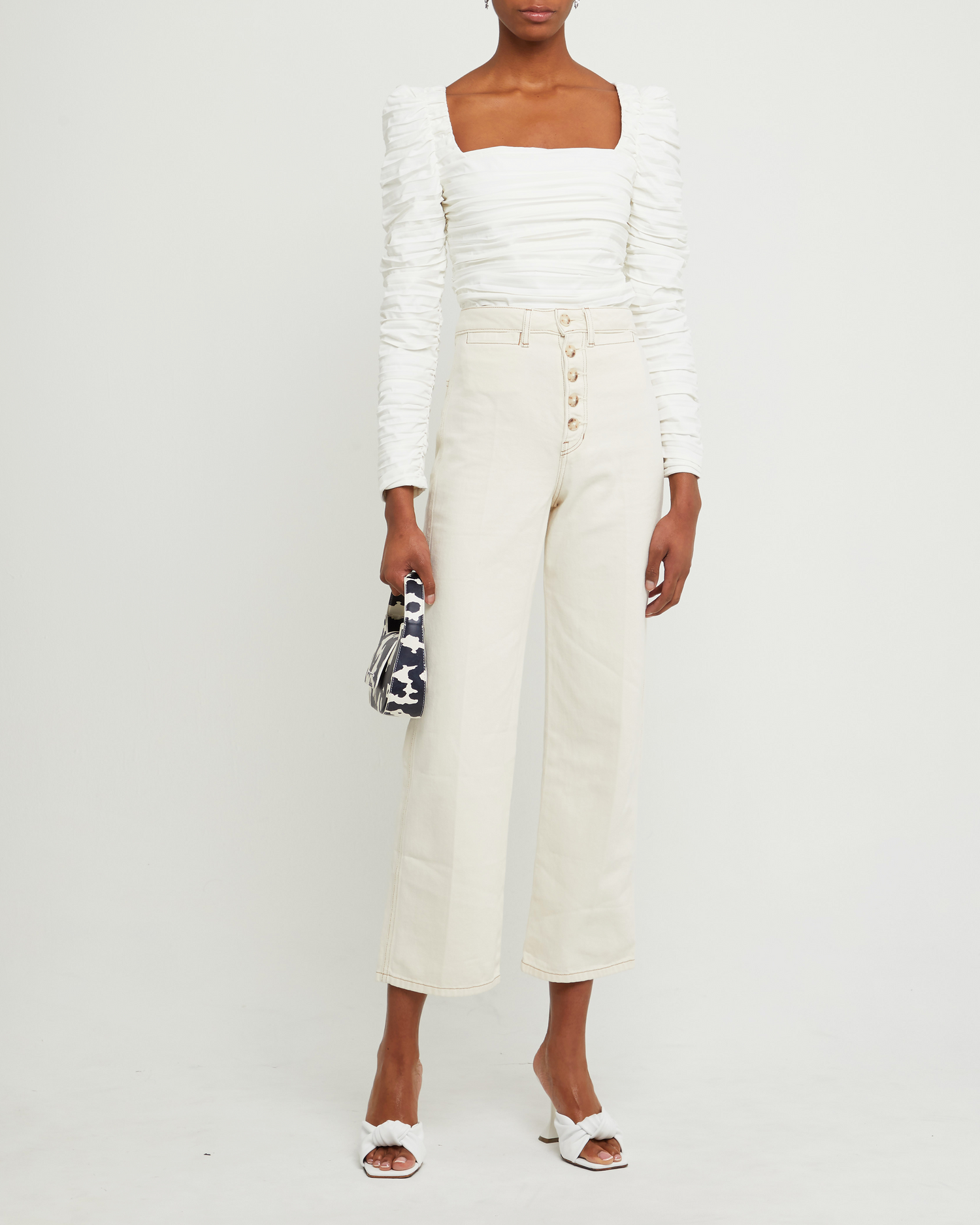 Elevated and chic, this ruched blouse is done in effortless, white cotton. Finished with a square neckline and subtle puffed sleeves.