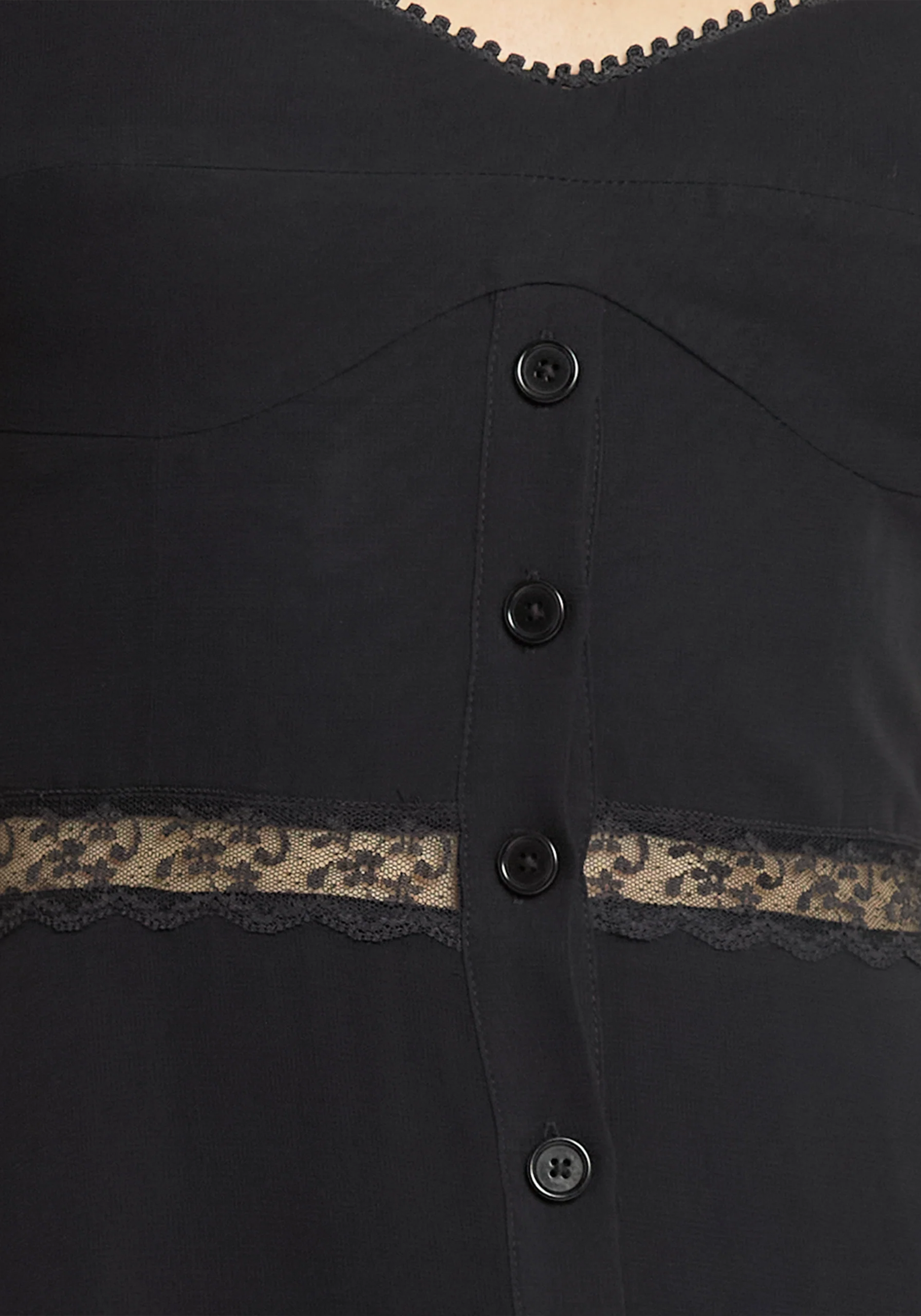 Upgrade your wardrobe with the Katelina Dress. Featuring an easy button-up design, this dress is made with gorgeous sheer lace details and paneling for a delicate and romantic feel.