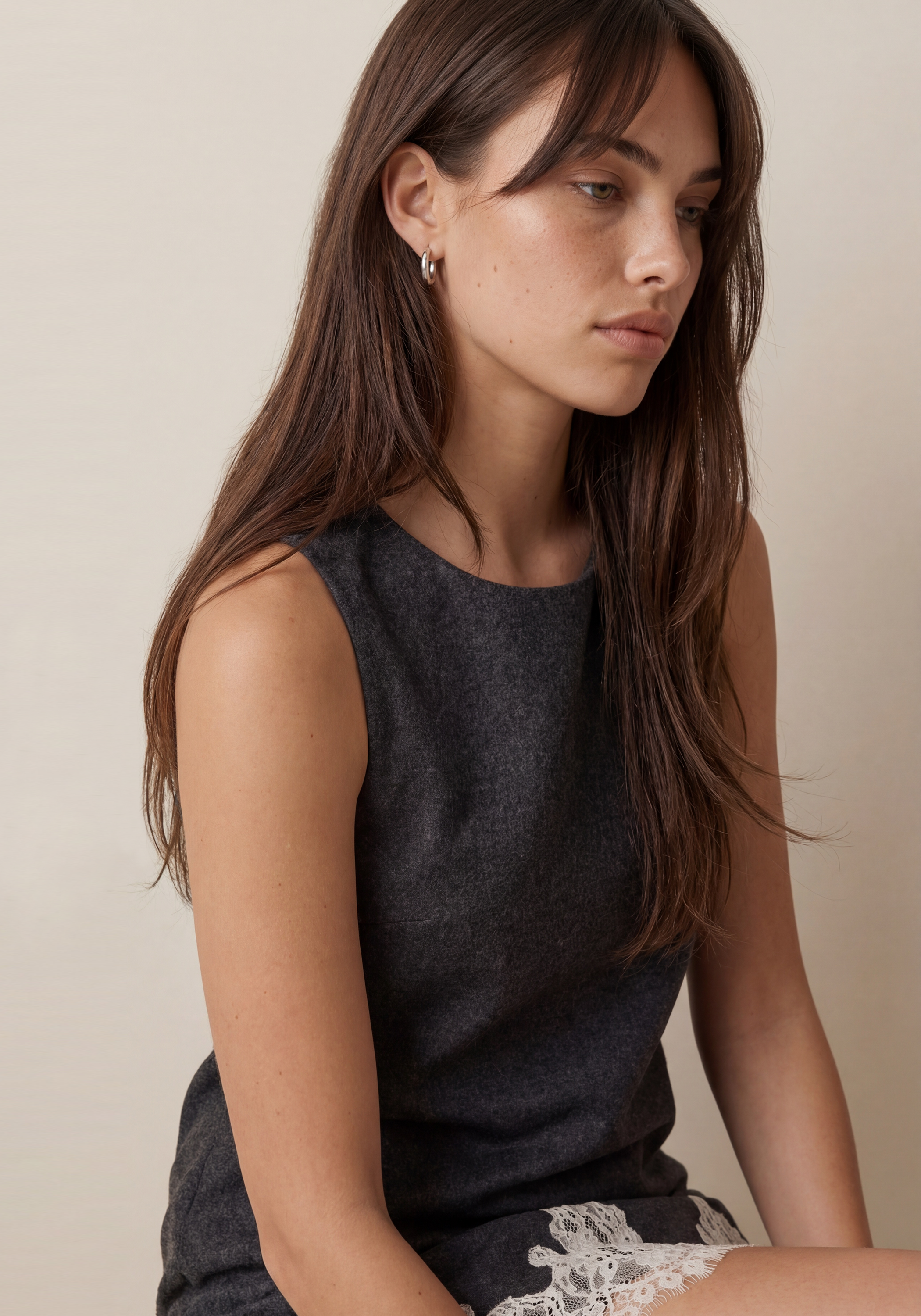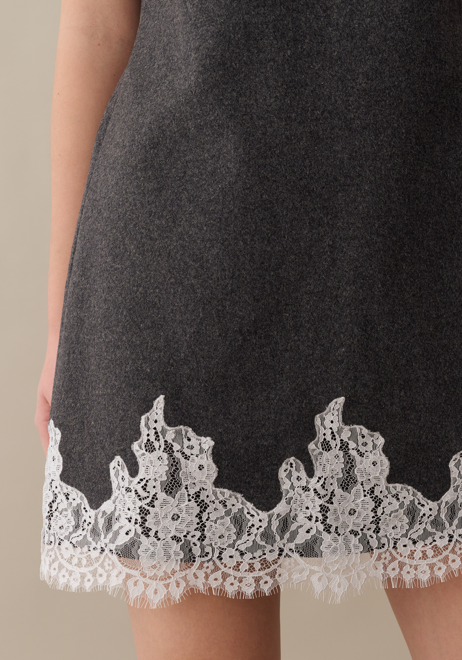 This relaxed shift style is done in a thicker wool material to feels as good as it looks. Fun and chic in all the right ways, and finished with a delicate, contrast lace trim.