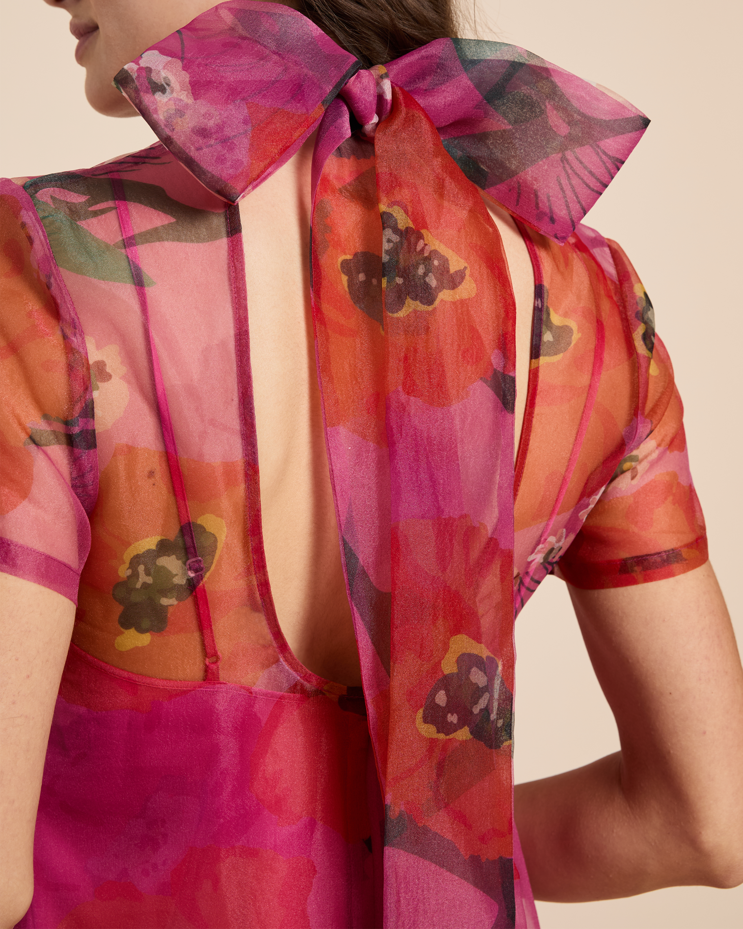 The Melody Dress features sheer organza fabric and an inner slip for a stunning, elegant look. Its back bow detail adds a touch of sophistication. With a maxi length, this gown is perfect for formal events.