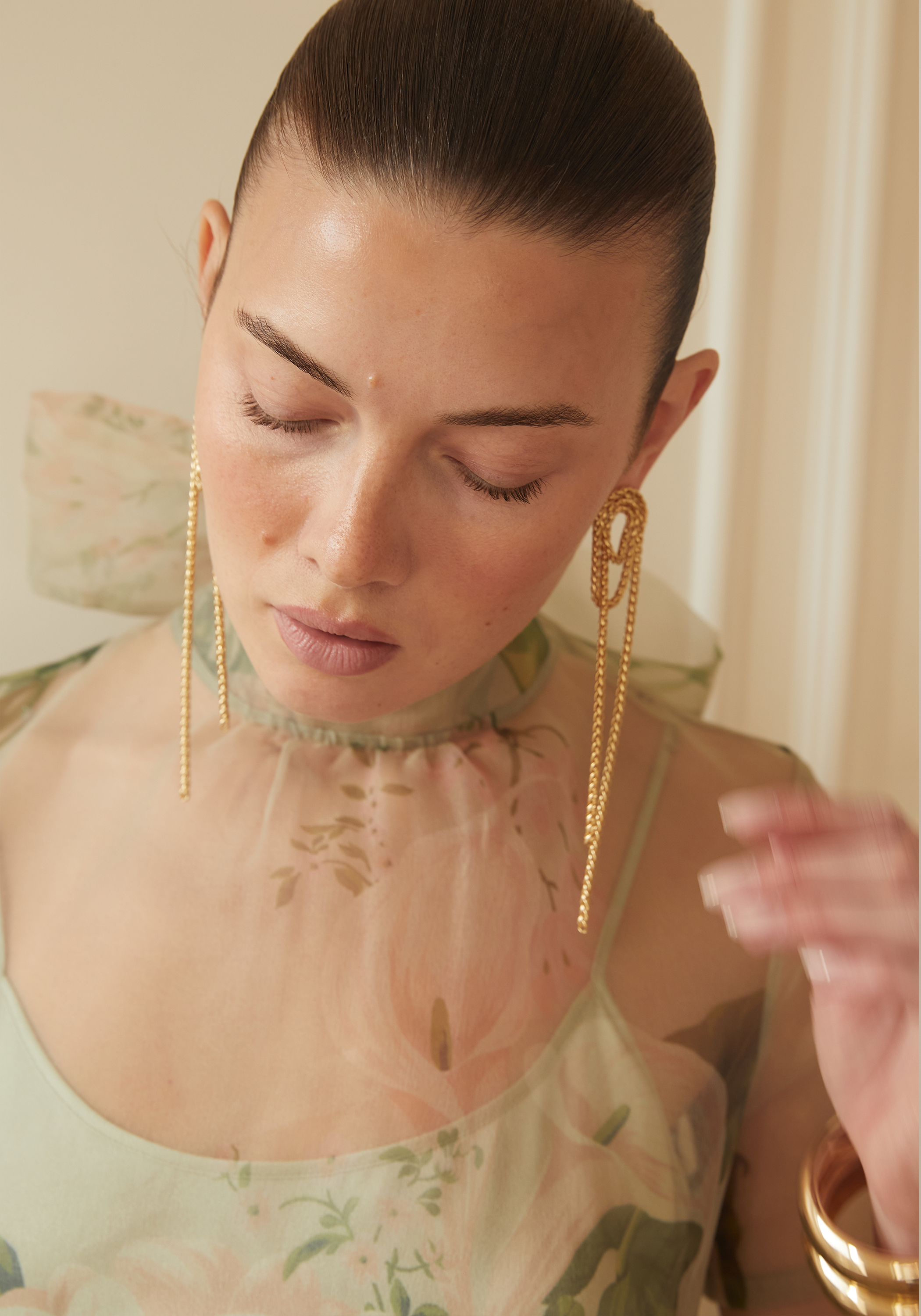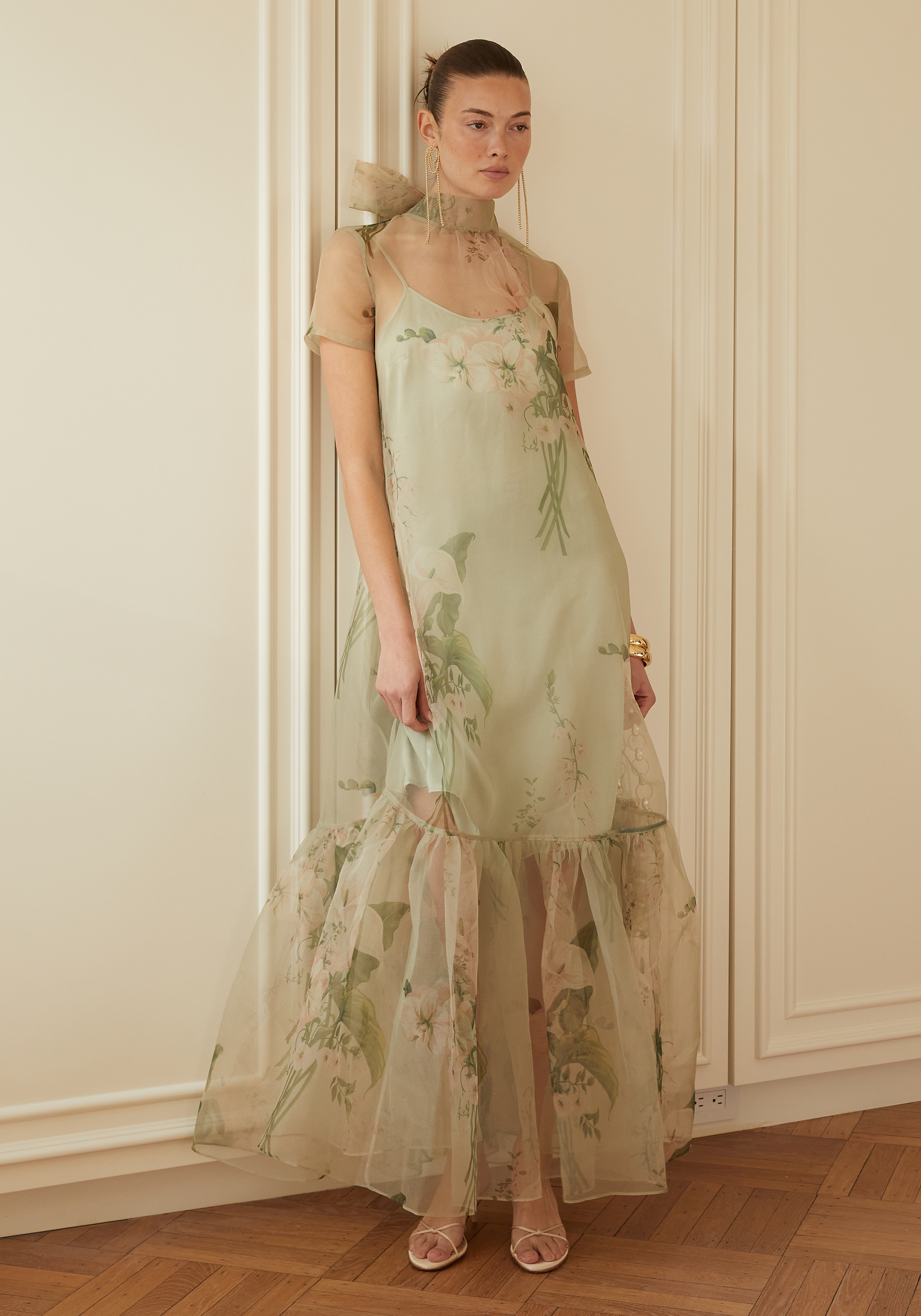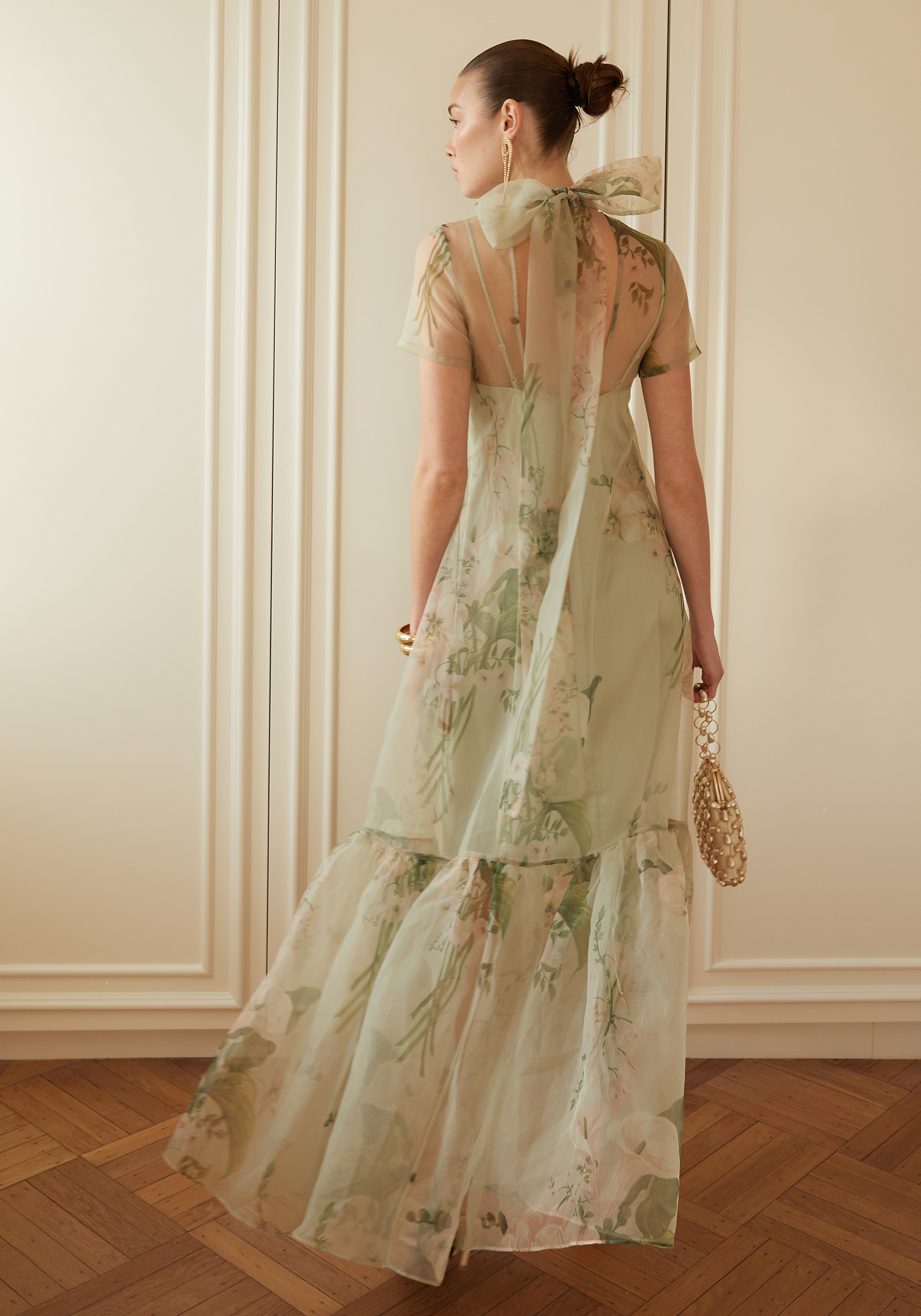 The Melody Dress features sheer organza fabric and an inner slip for a stunning, elegant look. Its back bow detail adds a touch of sophistication. With a maxi length, this gown is perfect for formal events.