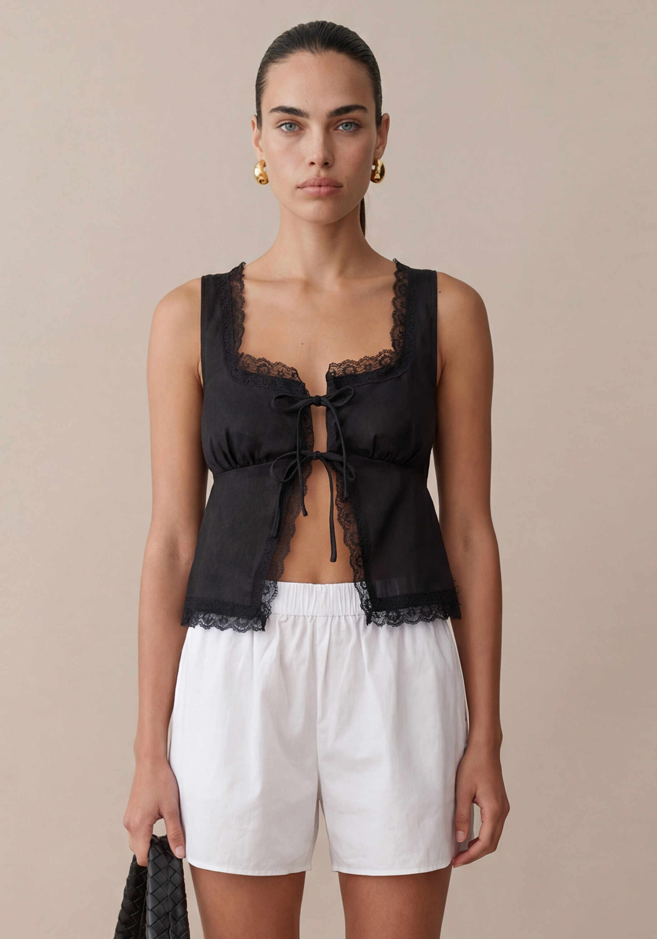 Crafted from beautiful linen, the Odette Top boasts a romantic lace trim and an open and airy design. Fastened with front ties, this top is both functional and stylish. Perfect for effortless summer style.