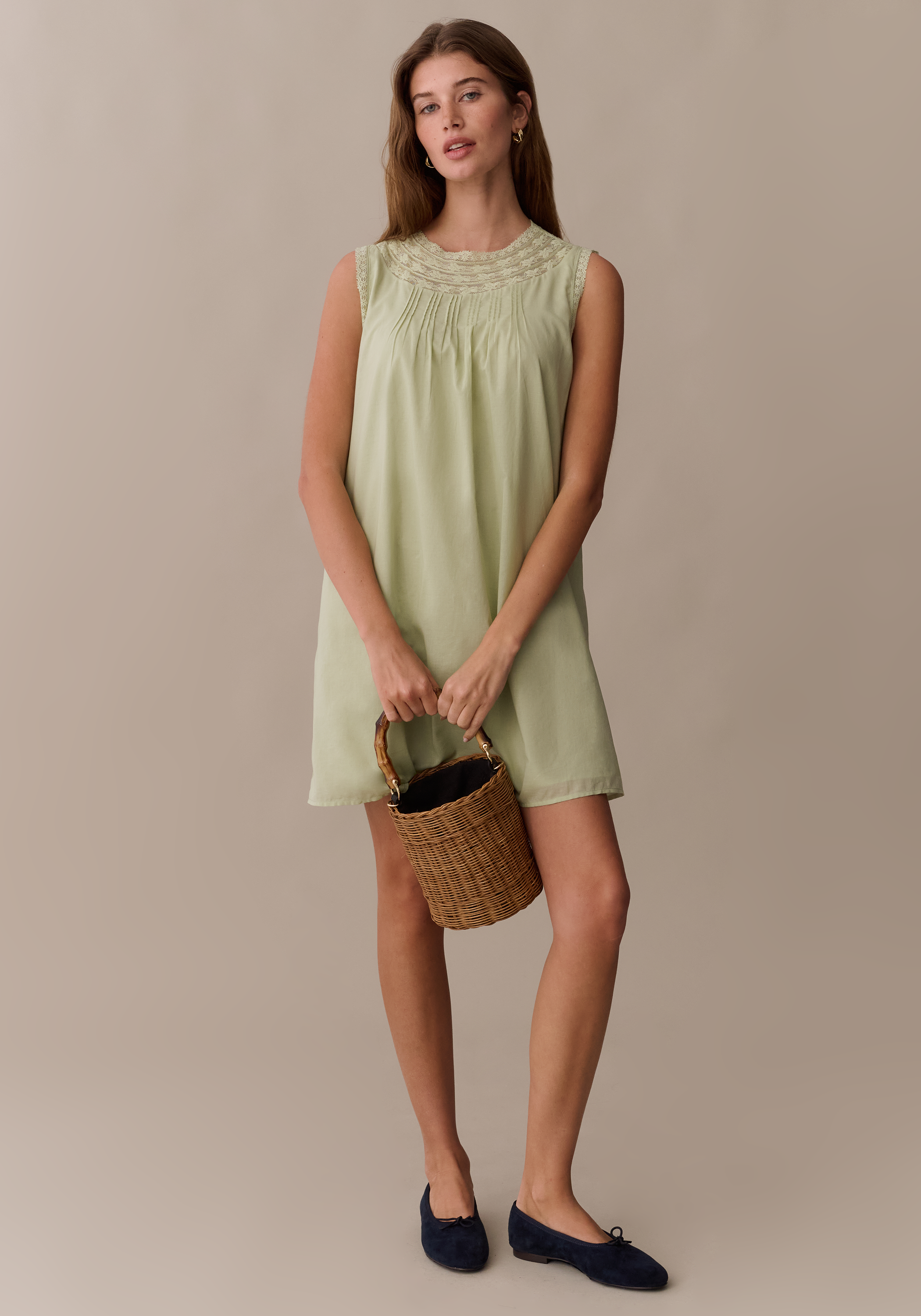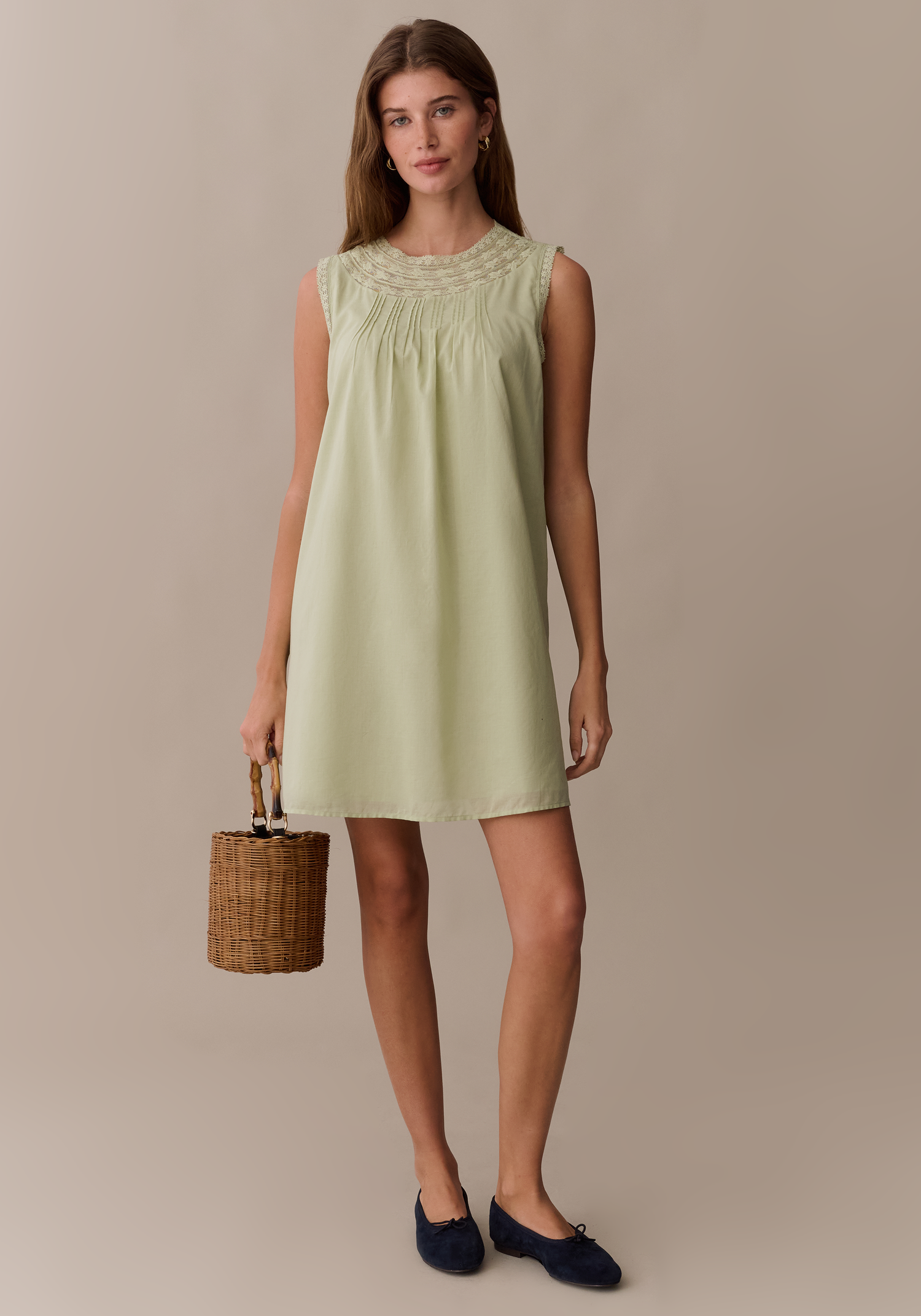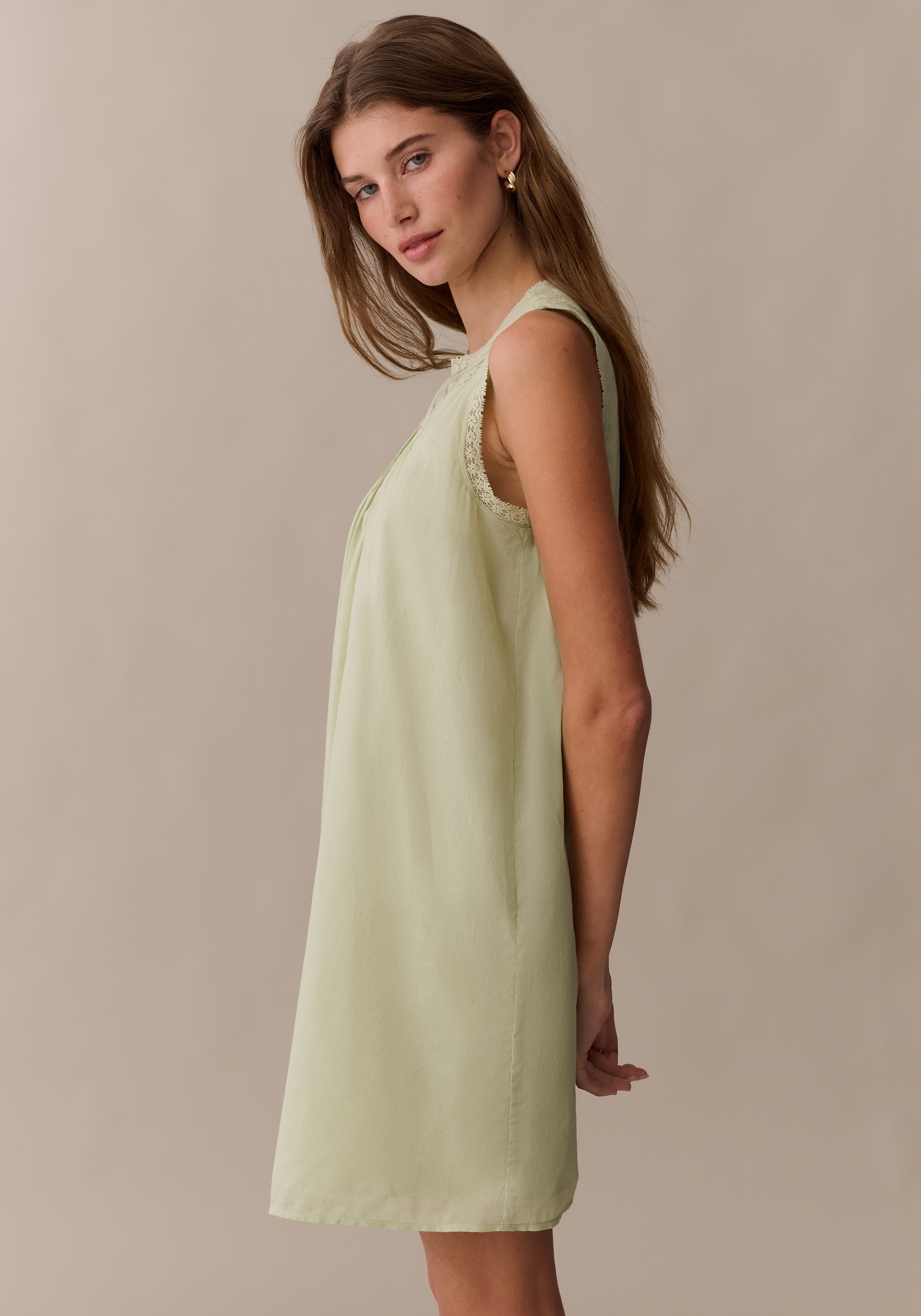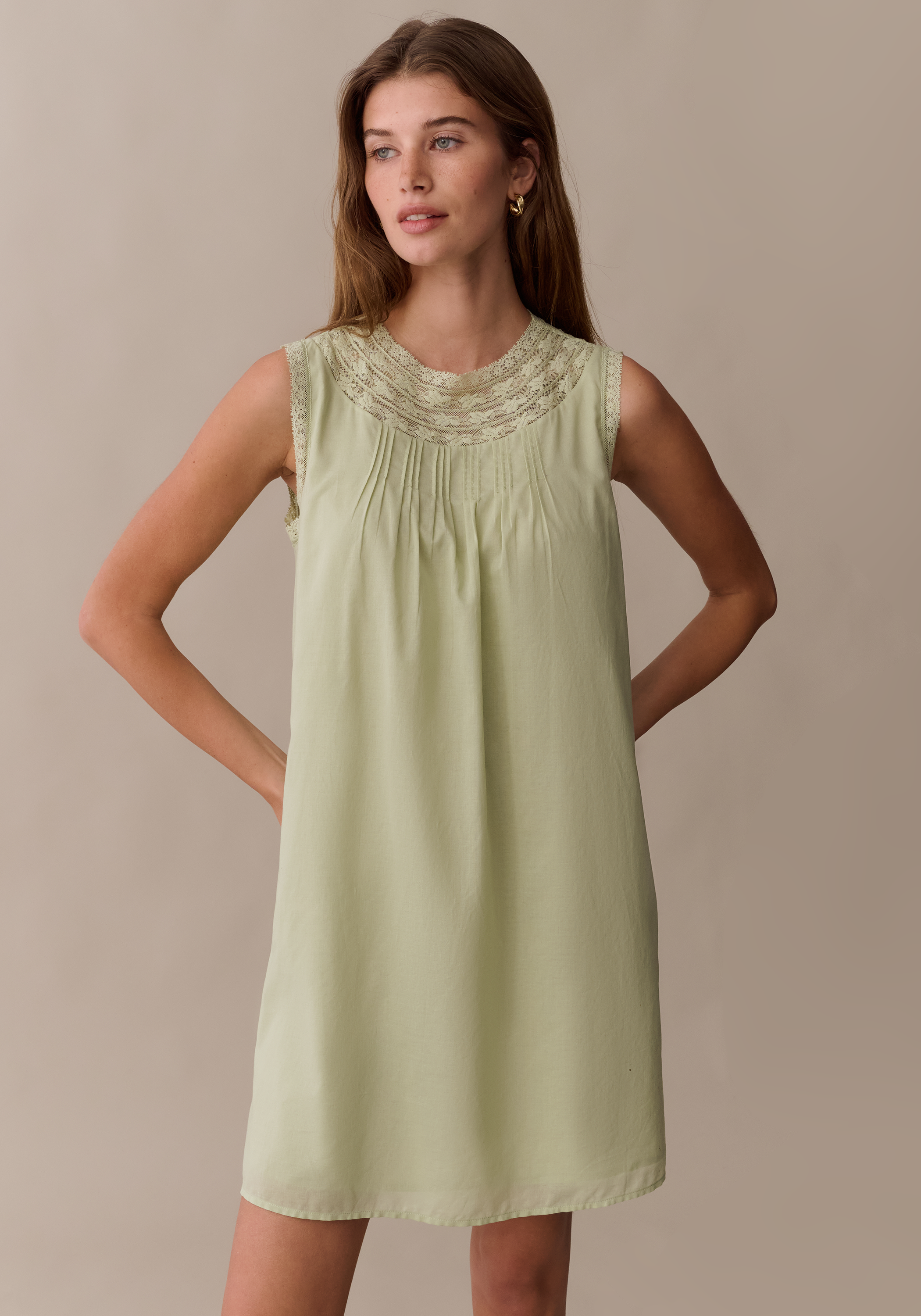 Slip into this sweet mini for an easy, effortless look. Delicate lace creates a high neckline, finished with charming covered buttons at the back. Done with a breezy, relaxed fit for the perfect, throw-on sundress.