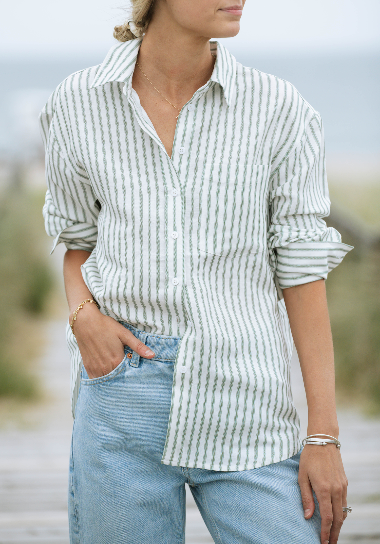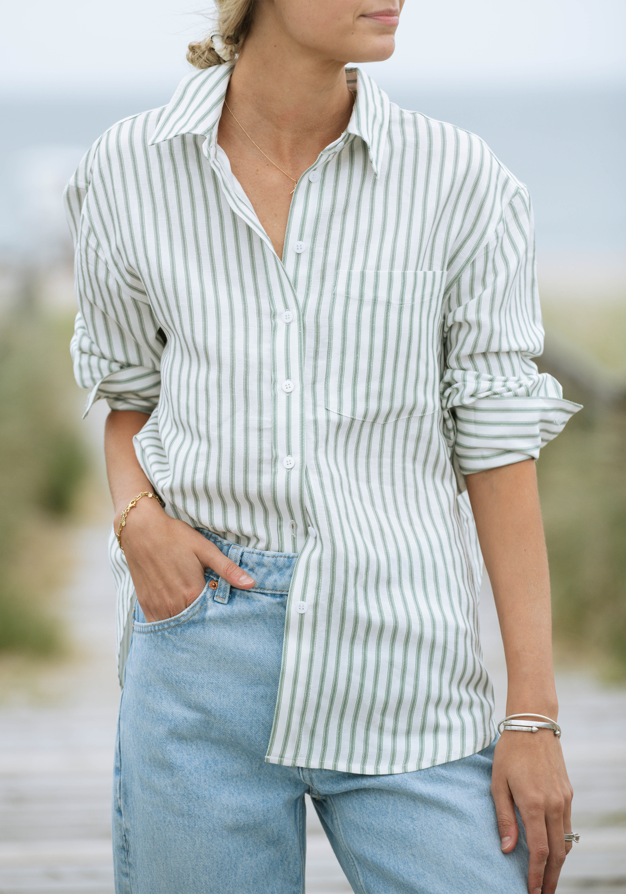 On trend green ticking stripe! Oversized but not swimming in this timeless button up shirt. Fabric irons easily, looks refined yet casual at the same time.