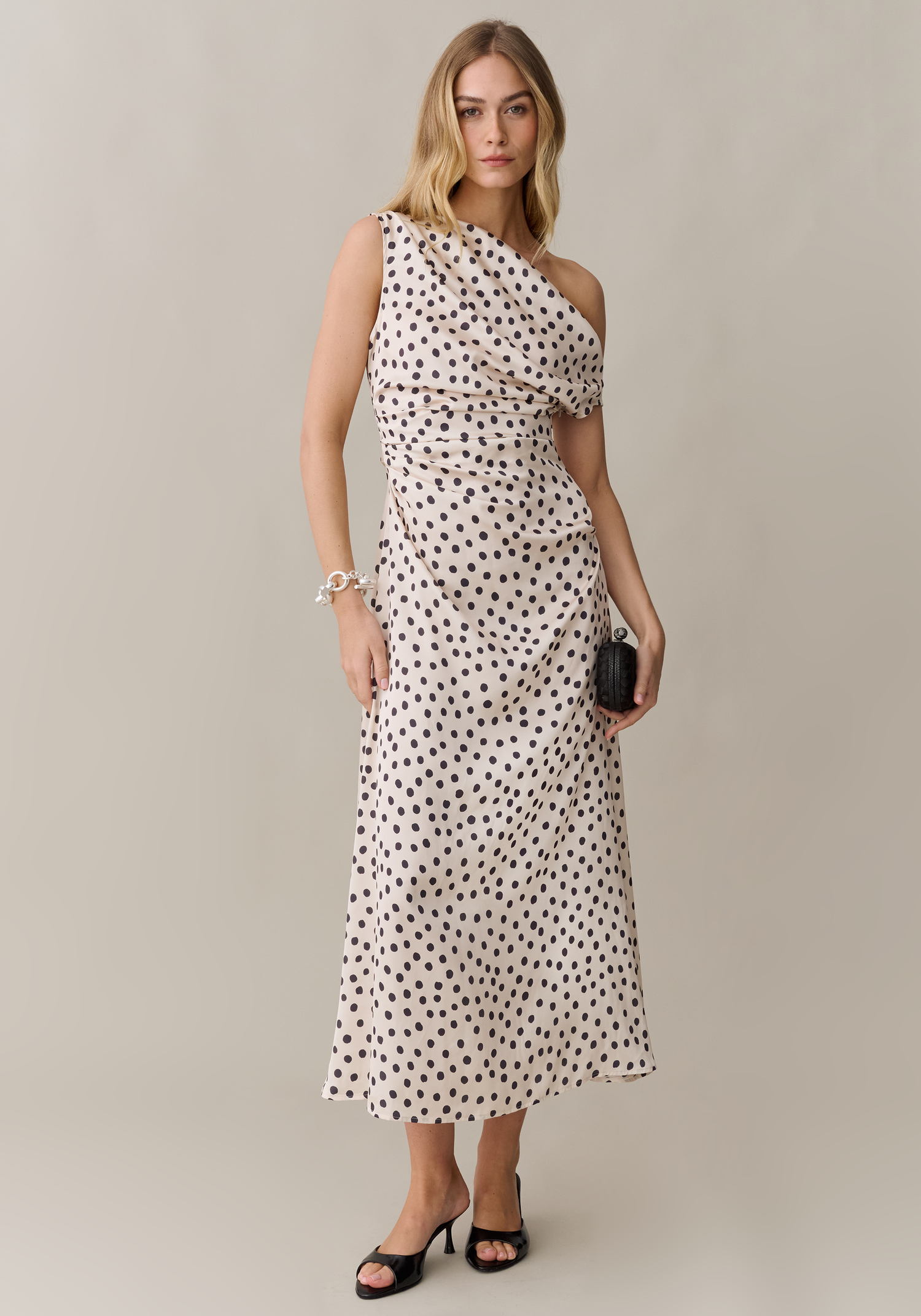 The Verity Dress delivers understated elegance with its silky fabric and off-the-shoulder design. Playful polka dots add personality while the fluid silhouette keeps things effortlessly chic.