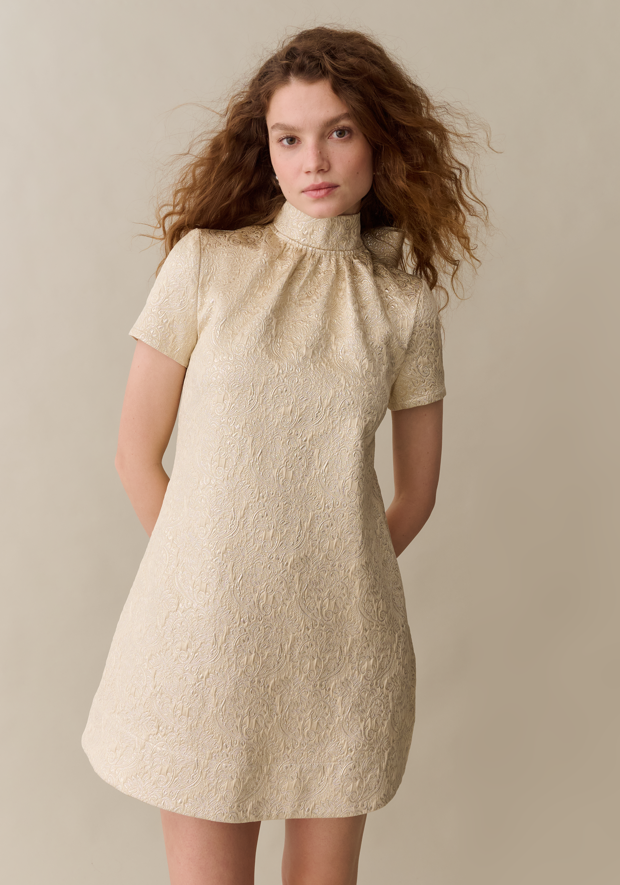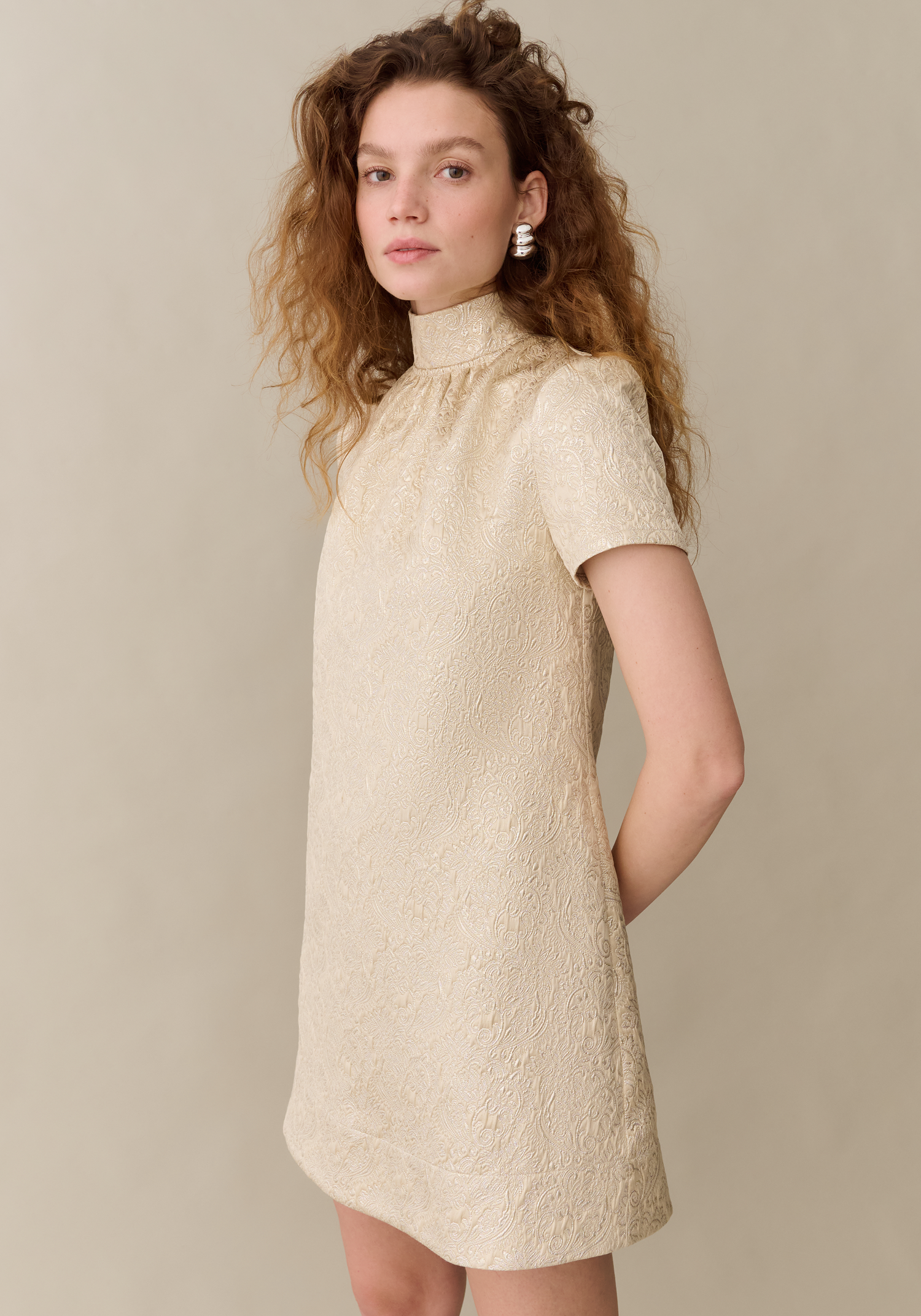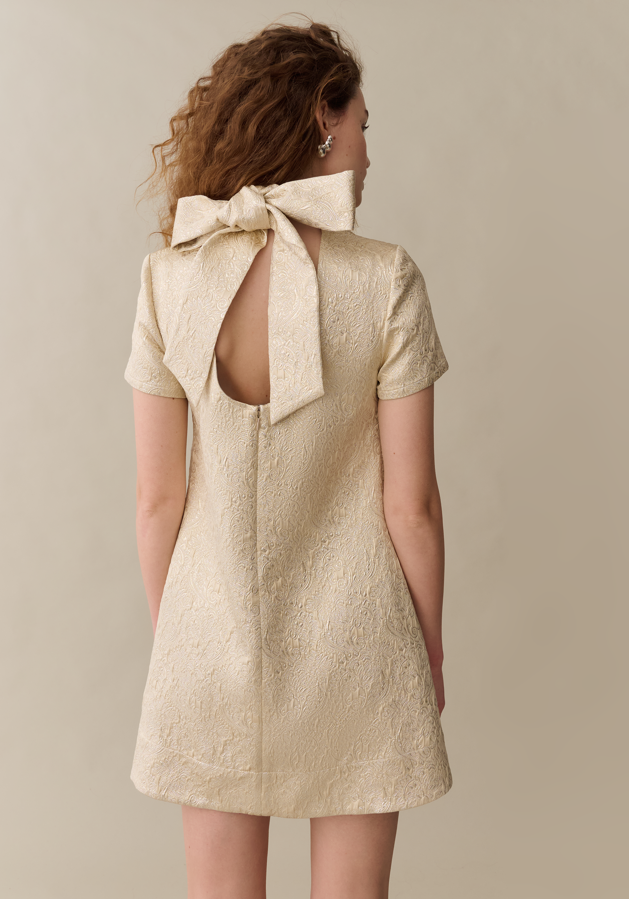 The Veya Dress combines a short sleeve silhouette with a chic mini length, done with a distinctive back bow detail for the perfect polished look. All crafted from exquisite brocade fabric that gently shimmers with a soft, elegant shine.